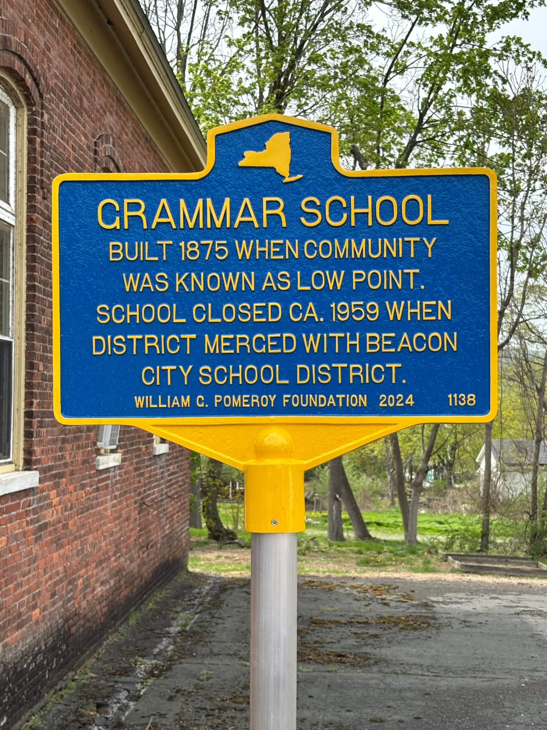 The historical marker commemorating the history of the former grammar school came about thanks to the students at Arlington High School, led by teacher Robert McHugh, who partnered with the Millbrook Historical Society to research the history of the school and successfully apply for grant funding for a historical marker through the Pomeroy Foundation.