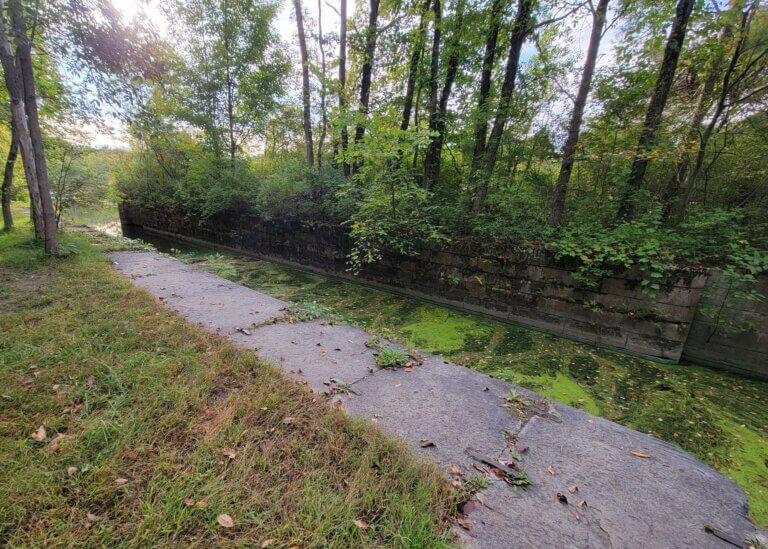 Located amid the hiking trails of Great Bear Springs Recreation Area in Fulton, New York sits the historic remnants of Guard Lock 2, which managed water levels on the Oswego Canal during times of flooding. The lock is accessible on foot by taking the River’s Landing Loop, which will bring visitors directly to its location. Additionally, the lock is accessible by water, and kayakers and canoers can paddle through the historic structure that allowed the Oswego Canal to operate efficiently. As of 2022, designated lots for parking remain free and open to the public, and the path to the lock remains maintained by a dedicated volunteer crew.