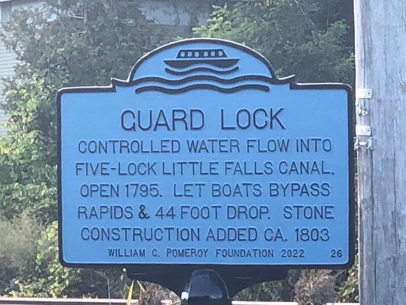 Later stone construction was added to the canal CA. 1803; remnants of this construction can still be seen at the site of the marker. The WILNC went on to construct subsequent canals in in German Flatts, Rome, and Wood Creek. During his 1810 journey across upstate New York, De Witt Clinton visited the Little Falls Canal, which he wrote about in his private journal. Following the completion of the Erie Canal, it is reported that the Little Falls Canal was used to store boats passing through. This marker sits within view of the stone guard lock, which controlled water flow into the Little Falls Canal.