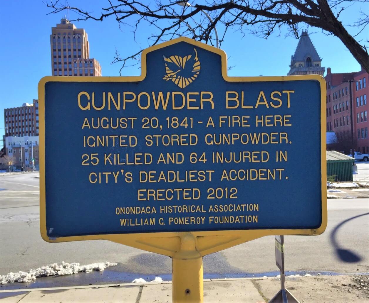 On the evening of August 20, 1841 an alarm was given for a fire at the carpentry shop of Charles Goings, situated the near the Oswego Canal in downtown Syracuse. The fire had attracted a crowd of spectators, while firefighters arrived at the scene and went to work to control the blaze. Unbeknownst to the people there that night, there was a large supply of gunpowder being stored in the back of the building. As the crowd watched and firefighters worked to put out the flames, the building suddenly exploded, which demolished the building, extinguished the fire, and sent wooden projectiles into the crowd. At least 25 people were killed and 64 people were wounded, making this one of deadliest accidents in the city’s history.