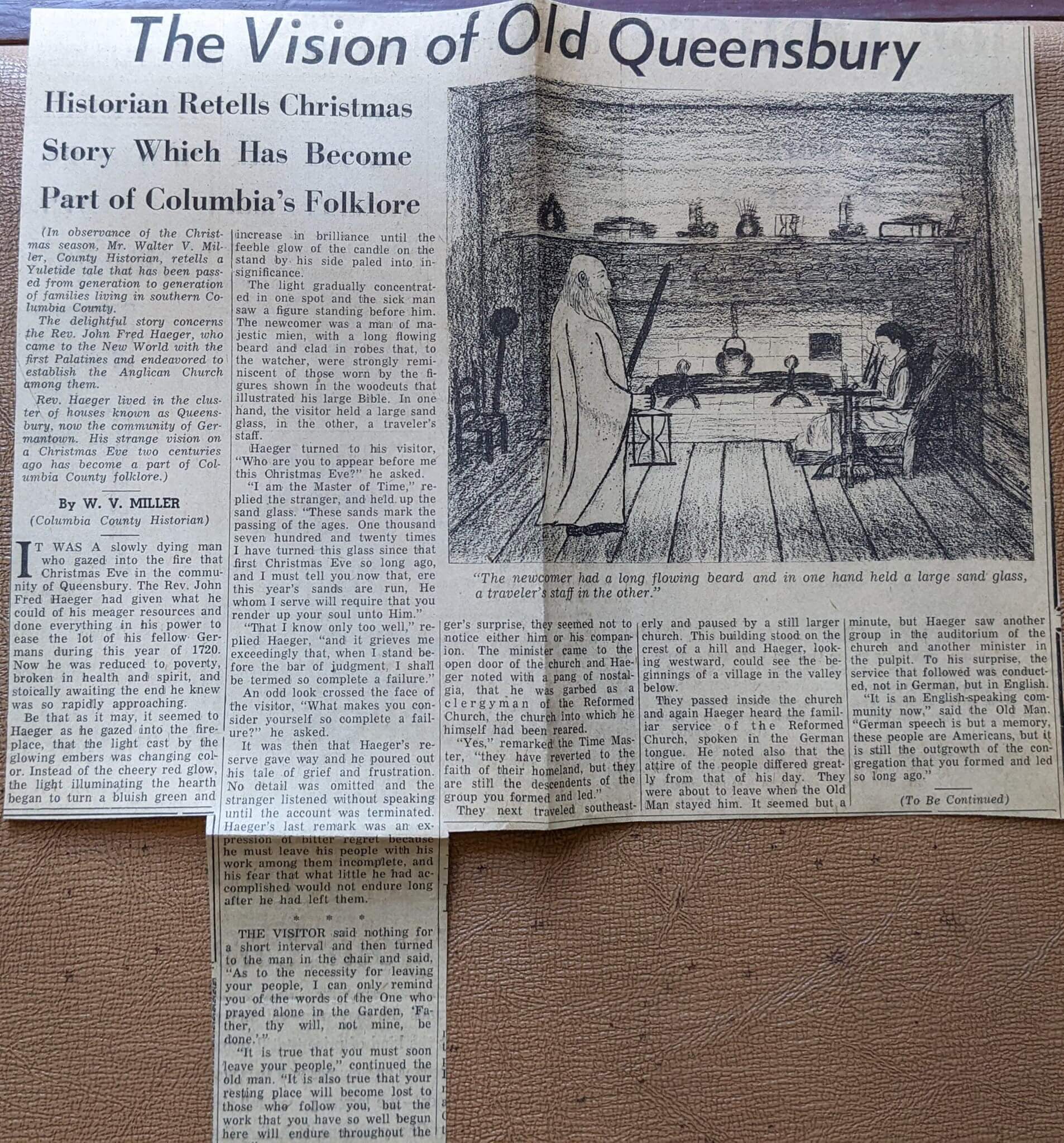 Yet, as legend recounts, a mysterious spirit known as the “Master of Time and Space” visited a dejected Rev. Haeger, unveiling visions of the Reformed Church of Germantown flourishing in the late eighteenth and then again in the nineteenth centuries. These glimpses into the future rejuvenated Rev. Haeger’s spirit, inspiring him to return to the pulpit for a final Sunday sermon before he departed from this world. This legendary event, captured in documents including 1960s newspaper articles by Town of Germantown Historian Walter V. Miller, speaks of hope, resilience, and the power of belief in the face of adversity.