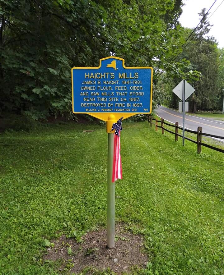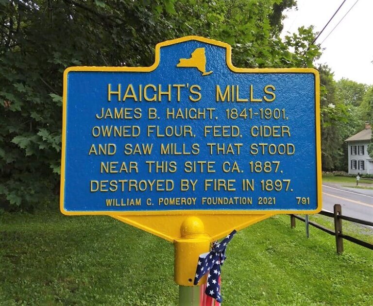 Built sometime prior to 1887, Haight’s mills, owned by James B. Haight (1841-1901), consisted of a sawmill and series of mill buildings used to produce flour, feed, and cider. The mills served local area farmers and thrived until 1897, when a large fire consumed a significant portion of the mill property. A May 8, 1897 edition of the Millbrook Round Table newspaper describes the destruction of the mill in great detail:
