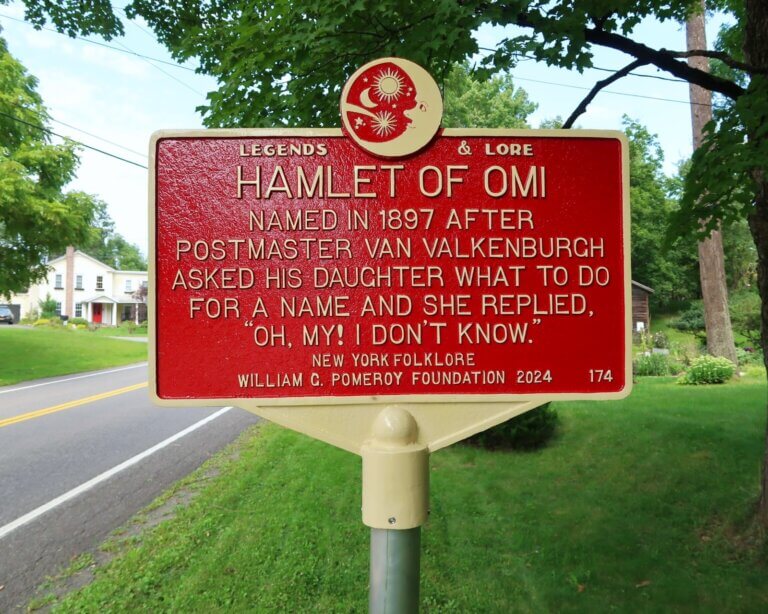In the hamlet of Omi, in Columbia County New York, a unique story is told on the origin of the community’s name, a story that has been passed down for almost as long as the name has existed. It is said that upon the establishment of a new post office in Columbia County in 1897, local postmaster J.J. Van Valkenburgh required a new name for the locale and sought out his daughter’s input. In response to what the name should be, she answered her father, “oh, my! I don’t know.” Thus inspiring the Omi name, and a distinct piece of place-name lore still shared by this community to this day.