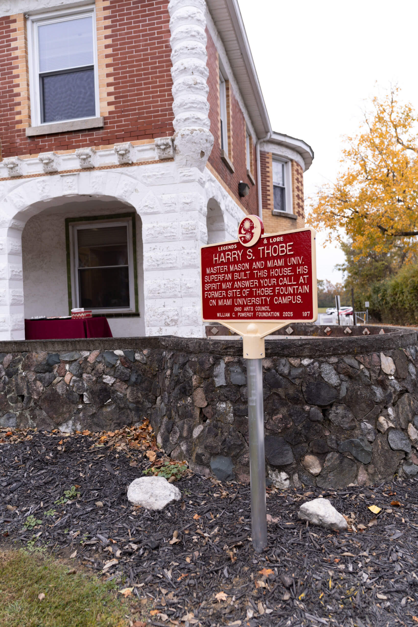 Harry Sylvester Thobe, born in Evansville, Indiana in 1870, was a talented bricklayer and stonemason. He moved to the town of Oxford, Ohio in 1895 after accepting a job to build a train depot at the intersection of Spring and Elm Street. After settling in town, Thobe went on to build several structures, including a few for Miami University. He crafted a fountain from rough stone and donated it to the university in the early 1900s. Thobe was said to have dutifully maintained “Thobe Fountain” until his death in 1950. The fountain was eventually replaced, and the university’s Kappa Kappa Gamma centennial memorial now sits in its place. Thobe’s masterpiece, a family home titled “Sunset Place”, was built over the span of 20 years.