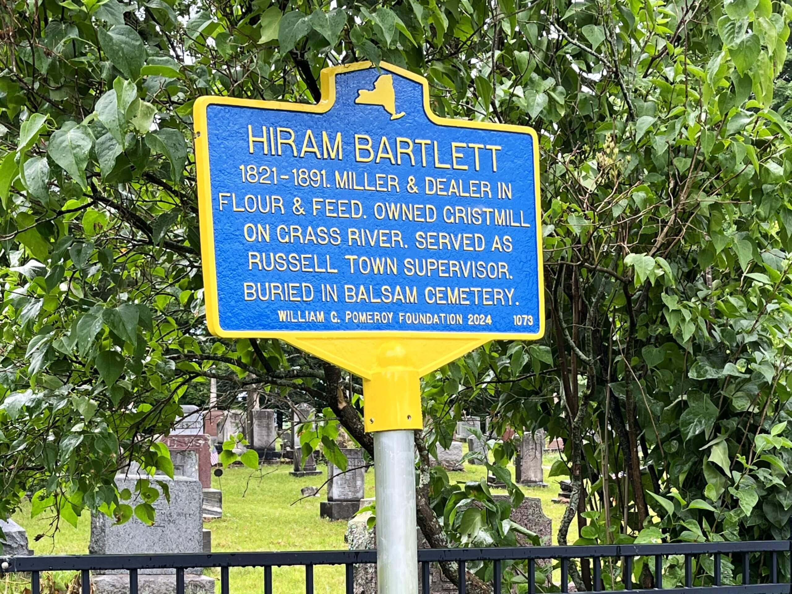Mr. Bartlett passed away in his town of Russell residence reportedly of pneumonia in March 1891. He is buried in Balsam Cemetery in the town. A notice of his death published in the March 11, 1891 St. Lawrence Plaindealer noted that he “was respected for his honesty and benevolence.”
