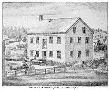 Hiram Bartlett (1821-1891) was a prominent businessman in the town of Russell in St. Lawrence County, New York. He served as a town supervisor and worked as a miller and dealer in flour and feed. He also served as master mason of Russell Lodge, No. 566 in the 1870s. During his career, Mr. Bartlett owned and operated a gristmill on Grass River in Russell. According to the 1878 History of St. Lawrence Co., New York, published by L.H. Everts & Co., he had erected his three-story mill in 1863 to replace an earlier mill that had burned down, which he had been in operation of since 1856.