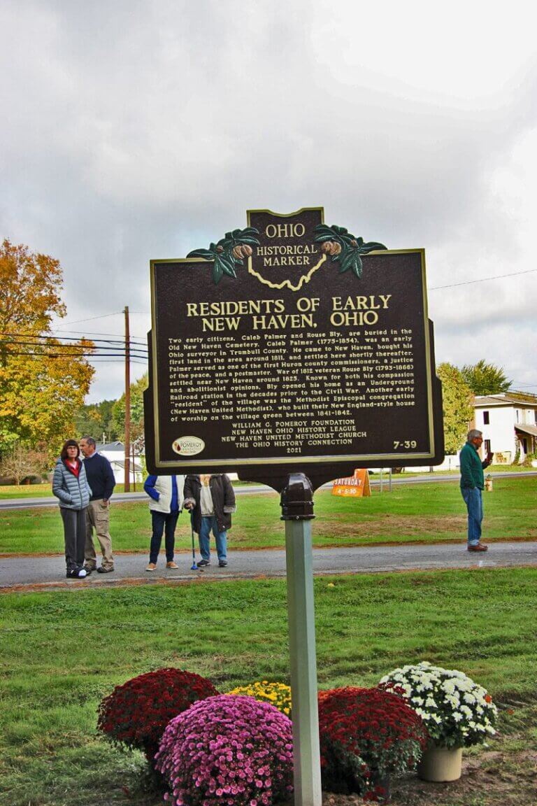 Two early citizens, Caleb Palmer and Rouse Bly, are buried in the Old New Haven Cemetery. Caleb Palmer (1775-1854), was an early Ohio surveyor in Trumbull County. He came to New Haven, bought his first land in the area around 1811, and settled here shortly thereafter. Palmer served as one of the first Huron county commissioners, a justice of the peace, and a postmaster. War of 1812 veteran Rouse Bly (1793-1866) settled near New Haven around 1825. Known for both his compassion and abolitionist opinions, Bly opened his home as an Underground Railroad station in the decades prior to the Civil War. Another early “resident” of the village was the Methodist Episcopal congregation (New Haven United Methodist), who built their New England-style house of worship on the village green between 1841-1842.