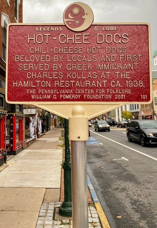 Since the late 1930s, Hot-Chee Dogs have been a cherished part of the food culture in Carlisle, PA. Sometimes simply called hotchees, this localized version of the chili-cheese dog was first served up by Greek immigrant Charles Kollas at The Hamilton Restaurant in downtown Carlisle. Kollas was the original owner of The Hamilton, part of the community’s “Greek Row,” where many Greek-owned establishments were located. Community members still recall stories about Kollas speedily working in the restaurant’s front window with hot dogs running up his arm just to keep up with demand.