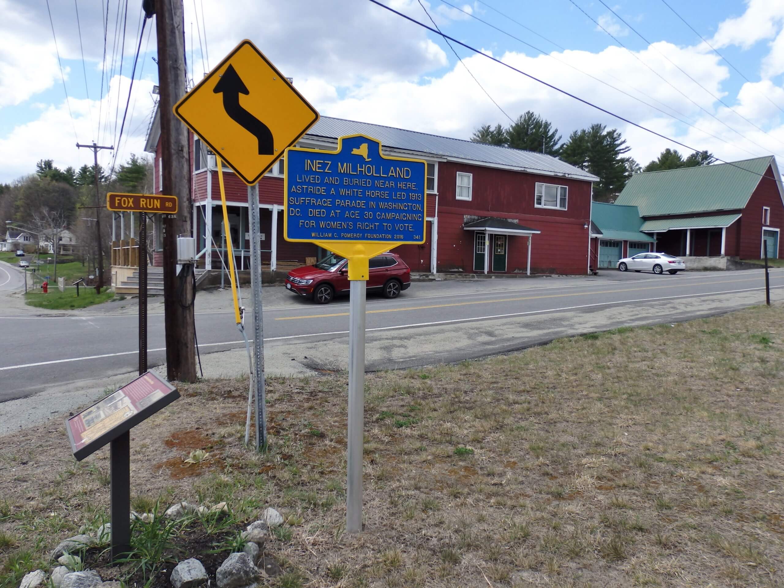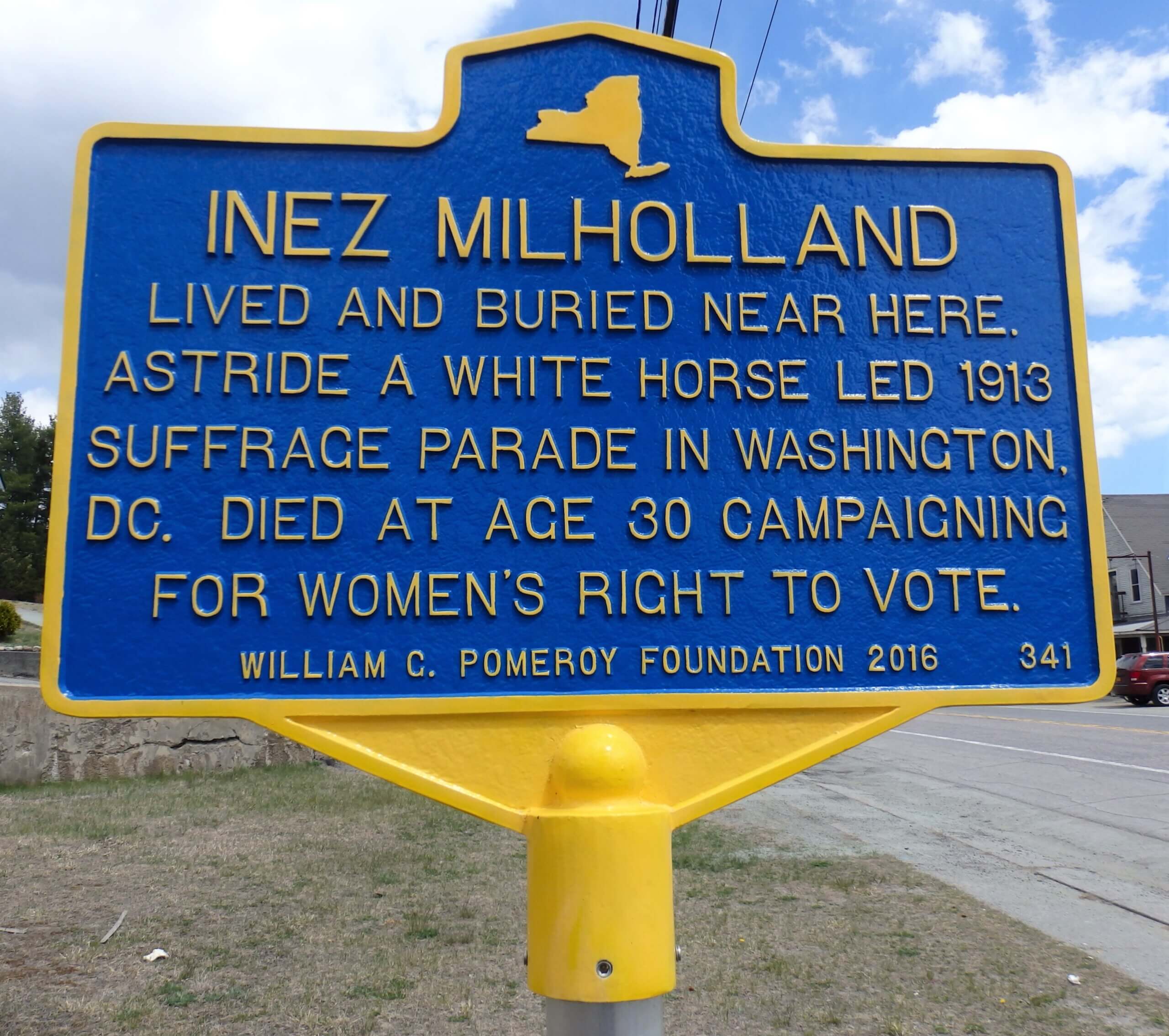 Near this site Inez Milholland, suffragist, war correspondent, and labor lawyer, is buried. A strong proponent of women’s rights, she was a popular speaker. Milholland is probably most famous for when she rode astride a white horse leading the 1913 Suffrage Parade in Washington, D.C. Tragically she died at the age of 30 while campaigning for women’s right to vote in Los Angeles, California.