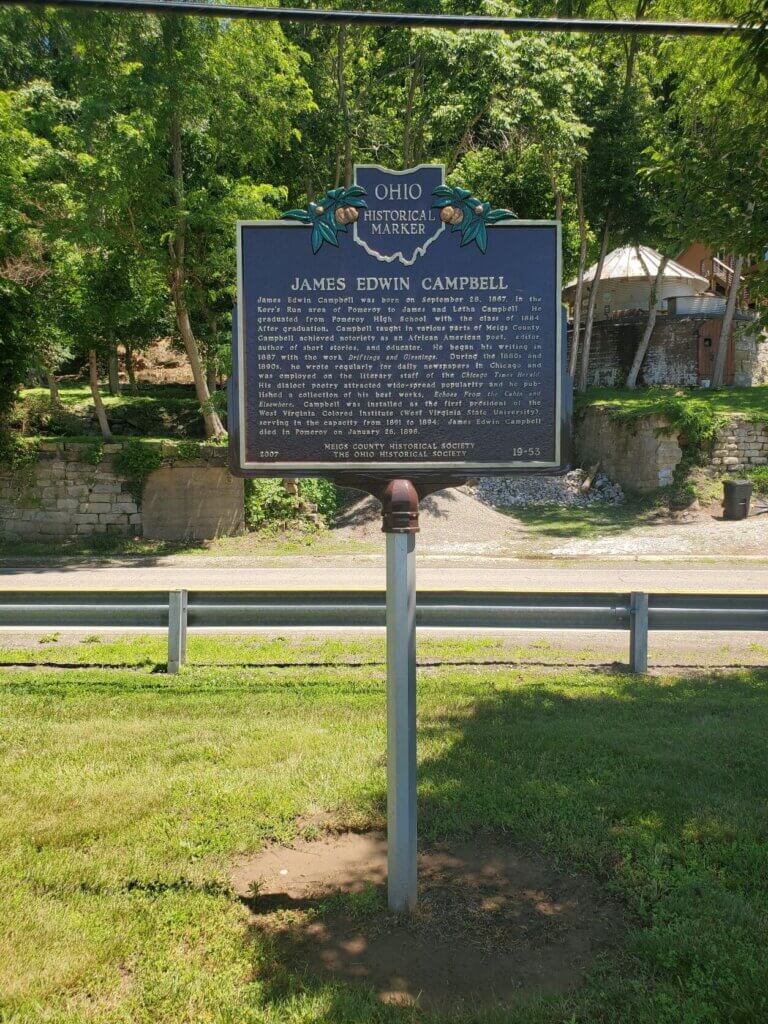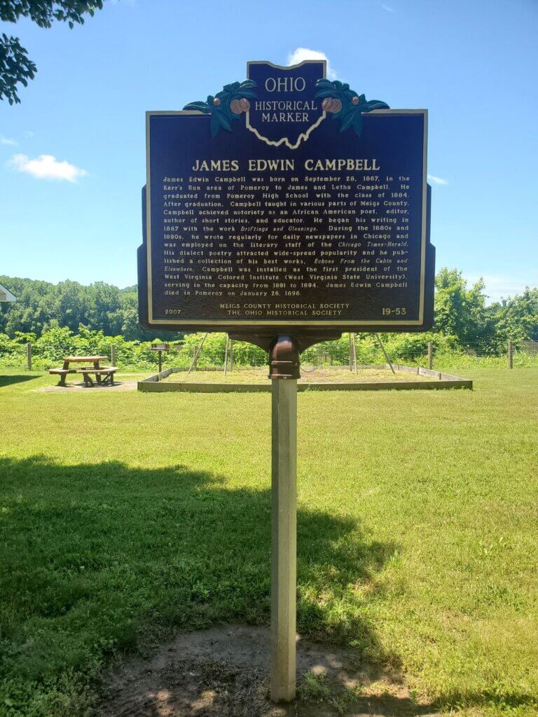 JAMES EDWIN CAMPBELLJames Edwin Campbell was born on September 28, 1867, in the Kerr’s Run area of Pomeroy to James and Letha Campbell. He graduated from Pomeroy High School with the class of 1884. After graduation, Campbell taught in various parts of Meigs County. Campbell achieved notoriety as an African American poet, editor, author of short stories, and educator. He began his writing in 1887 with the work Driftings and Gleanings. During the 1880s and 1890s, he wrote regularly for daily newspapers in Chicago and was employed on the literary staff of the Chicago Times-Herald. His dialect poetry attracted wide-spread popularity and he published a collection of his best works, Echoes From the Cabin and Elsewhere. Campbell was installed as the first president of the West Virginia Colored Institute (West Virginia State University), serving in the capacity from 1891 to 1894. James Edwin Campbell died in Pomeroy on January 26, 1896.