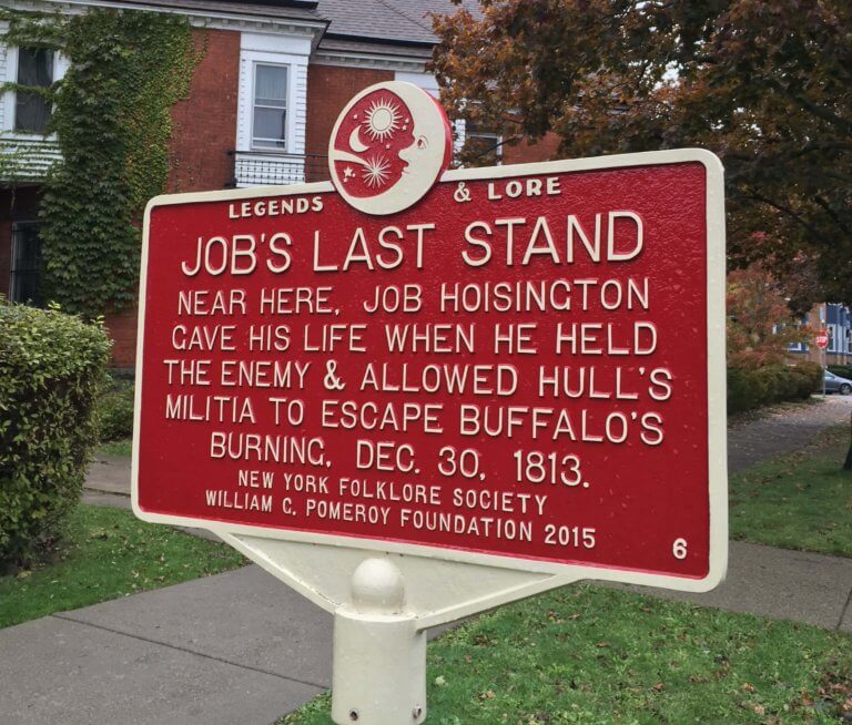 A preexisting New York Historical Marker for Buffalo and Erie County Historical Society on waymarking.com adds that Buffalo’s “1812 War hero” was born when “Gallant” Job Hoisington sacrificed his life near this site on Dec. 30, 1813. During a battle between Capt. Hull’s US Army Militia and British forces with their Native allies, the 51-year old Hoisington single-handedly held back the enemy at what is now the intersection of Porter and Plymouth Aves, granting his fellow militiamen, family, and other innocent villagers vital time to escape one of the worst horrors of the War of 1812: The Burning of Buffalo. Job’s sacrificial body was found nearby in spring 1814, just months before the War of 1812 ended.