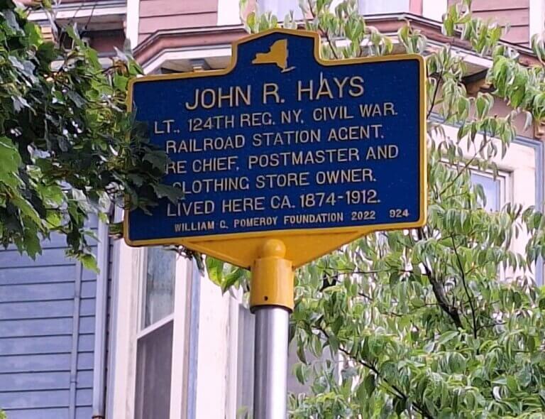 During the Civil War, John R. Hays served as Second Lieutenant in Company H of the 124th Regiment New York Volunteer Infantry (the “Orange Blossoms”). He enlisted in 1862 and served for three years before being discharged due to an injury. Upon his return to Walden, NY, John became an active community member in his capacity as a business owner and appointed official.