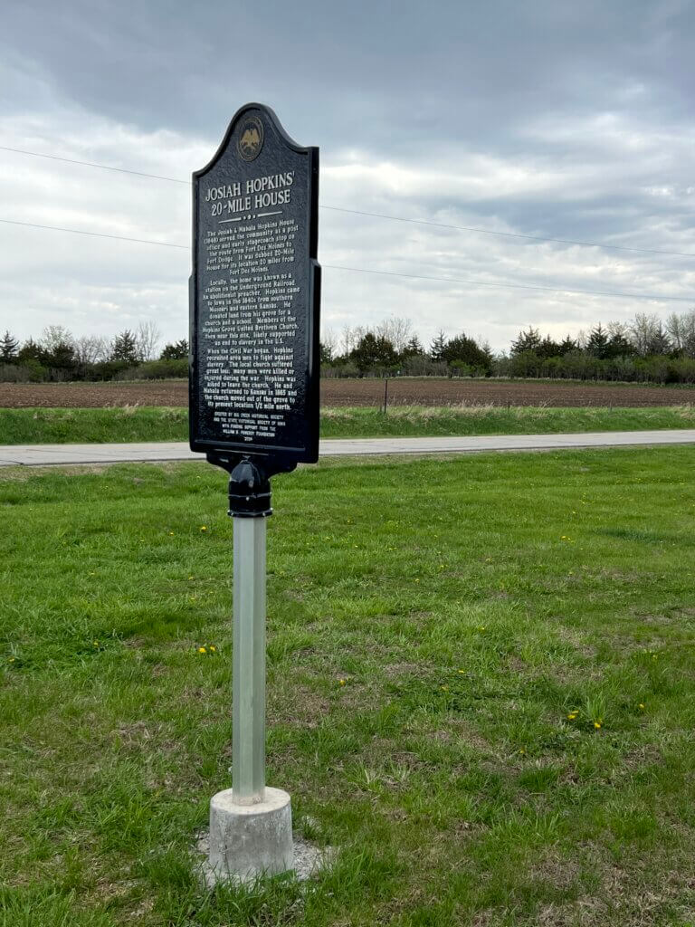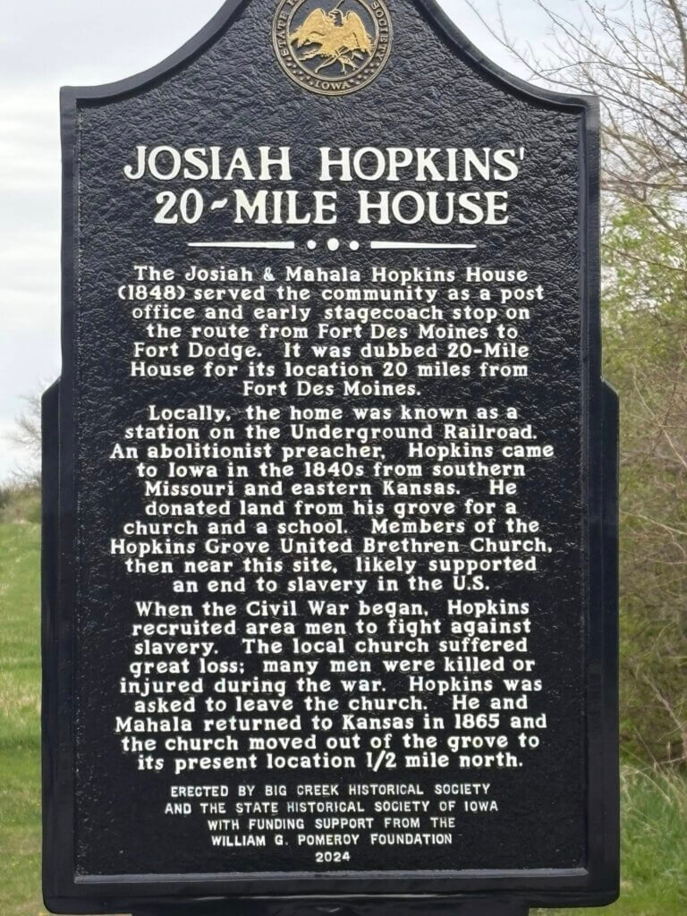 Josiah Hopkins' 20-Mile HouseThe Josiah & Mahala Hopkins House (1848) served the community as a post office and early stagecoach stop on the route from Fort Des Moines to Fort Dodge. It was dubbed 20-Mile House for its location 20 miles from Fort Des Moines. Locally, the home was known as a station on the Underground Railroad. An abolitionist preacher, Hopkins came to Iowa in the 1840s from southern Missouri and eastern Kansas. He donated land from his grove for a church and a school. Members of the Hopkins Grove United Brethren Church, then near this site, likely supported an end to slavery in the U.S. When the Civil War began, Hopkins recruited area men to fight against slavery. The local church suffered great loss; many men were killed or injured during the war. Hopkins was asked to leave the church. He and Mahala returned to Kansas in 1865 and the church moved out of the grove to its present location 1/2 mile north.