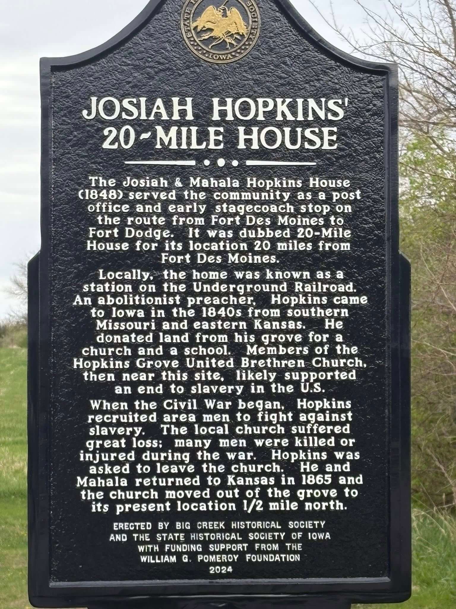 Erected by Big Creek Historical Society and the State Historical Society of Iowa with funding support from the William G. Pomeroy Foundation. 2024.