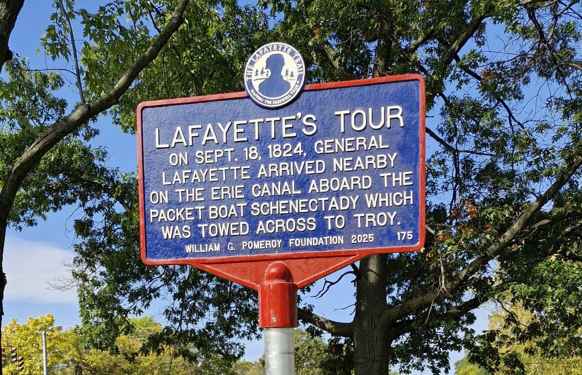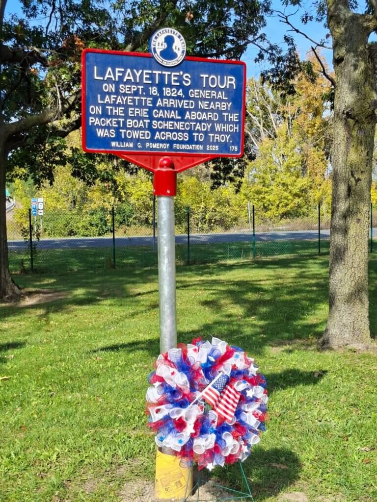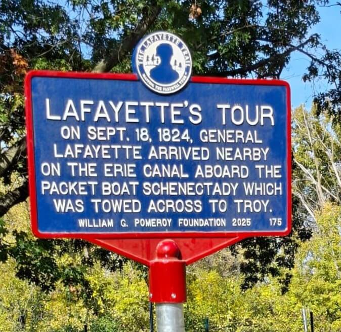 General Lafayette, accompanied by the Governor of New York and the Mayor of Albany, arrived from Albany aboard the packet board Schenectady. The cannon at the U.S. Arsenal in Gibbsonville (now Watervliet) announced his arrival. The General’s boat was met by a committee representing Troy. The Schenectady was then taken down through the locks into the Hudson River where eight sloops, each flying the American flag, were waiting to tow it across the river to Troy. Rowed by four oarsmen and guided by the sloop masters, the boats were arranged in a line and connected by hawsers, or strong, thick ropes. Aboard the Schenectady, a band played patriotic music. The sight was said to be a “strikingly beautiful spectacle”. (New York Stateman, 18 Sept 1824)