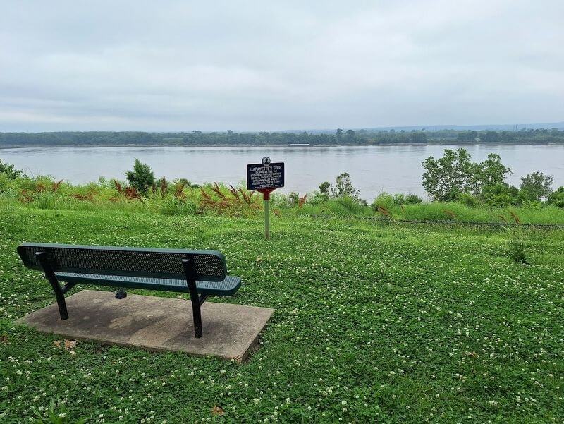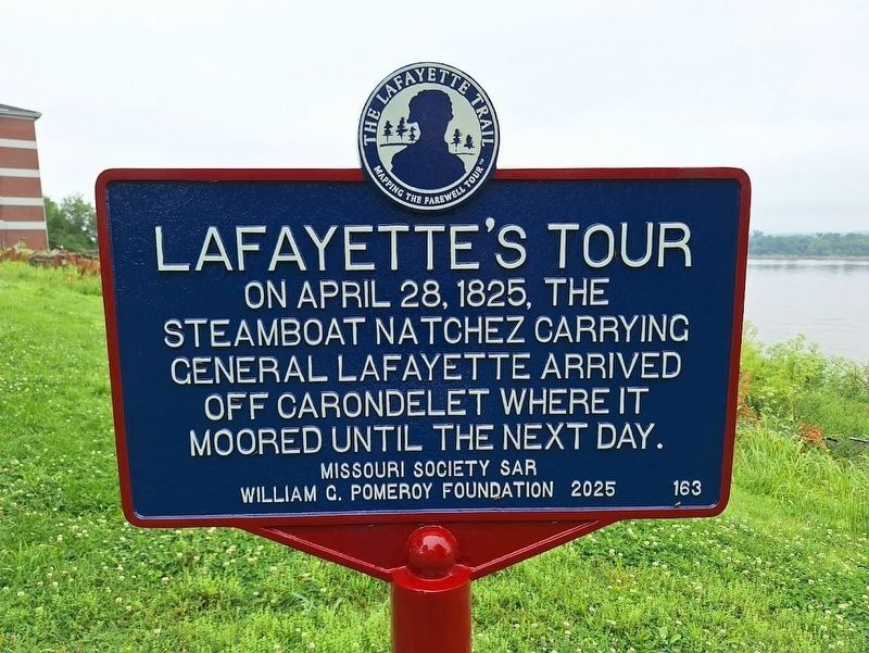 This will be the first and possible only Lafayette marker in the state. Lafayette’s overnight stay off Carondelet on April 28, 1825, prior to the formal reception in St. Louis would be commemorated with this marker. Lafayette was accompanied on the Steamboat Natchez by the committee from Louisiana. They anchored at the village of Carondelet and sent a messenger to the Gov. Clark of that Lafayette would arrive in St. Louis the next day. Gov. Clark and Gov. Coles of Illinois met Lafayette at the steamboat the following day, then proceeded upriver to the city. At 9 AM, they landed at the market house square and a national salute was fired. Lafayette rode into the city in a four-horse carriage at the head of a parade. A reception was given where anyone was welcome to come and greet him. He then attended an evening ball. Lafayette departed the following morning on the Natchez heading back east.