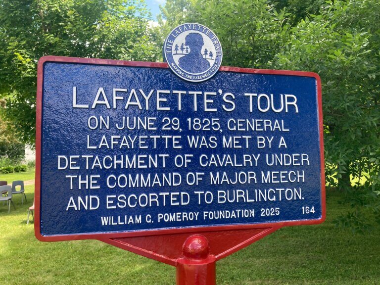 Lafayette was traveling from Windsor, VT through Montpelier, where he had addressed the First State House (today’s VT Supreme Court) the day before. Williston Road, now U.S. Route 2, follows the historic roadway, so it’s likely the entourage passed this way.