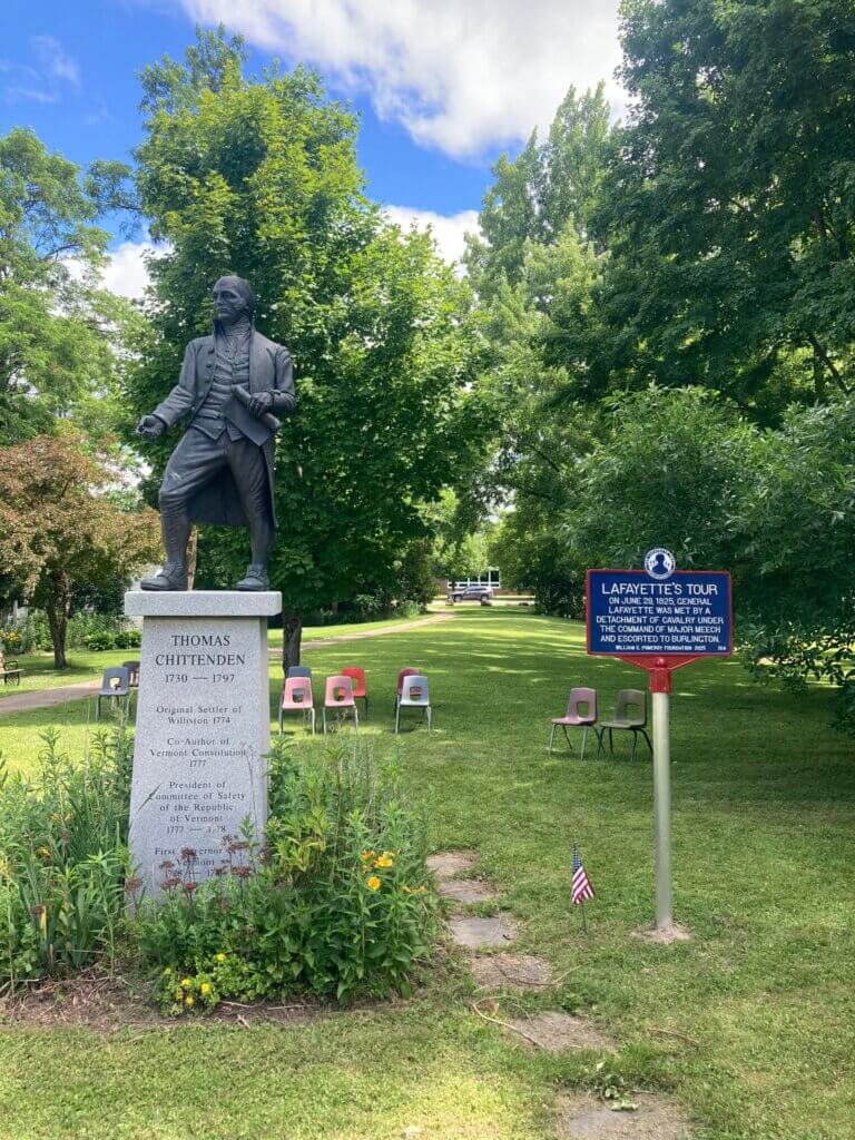 The marker stands on a public green, next to the statue of Thomas Chittenden, first governor of Vermont.