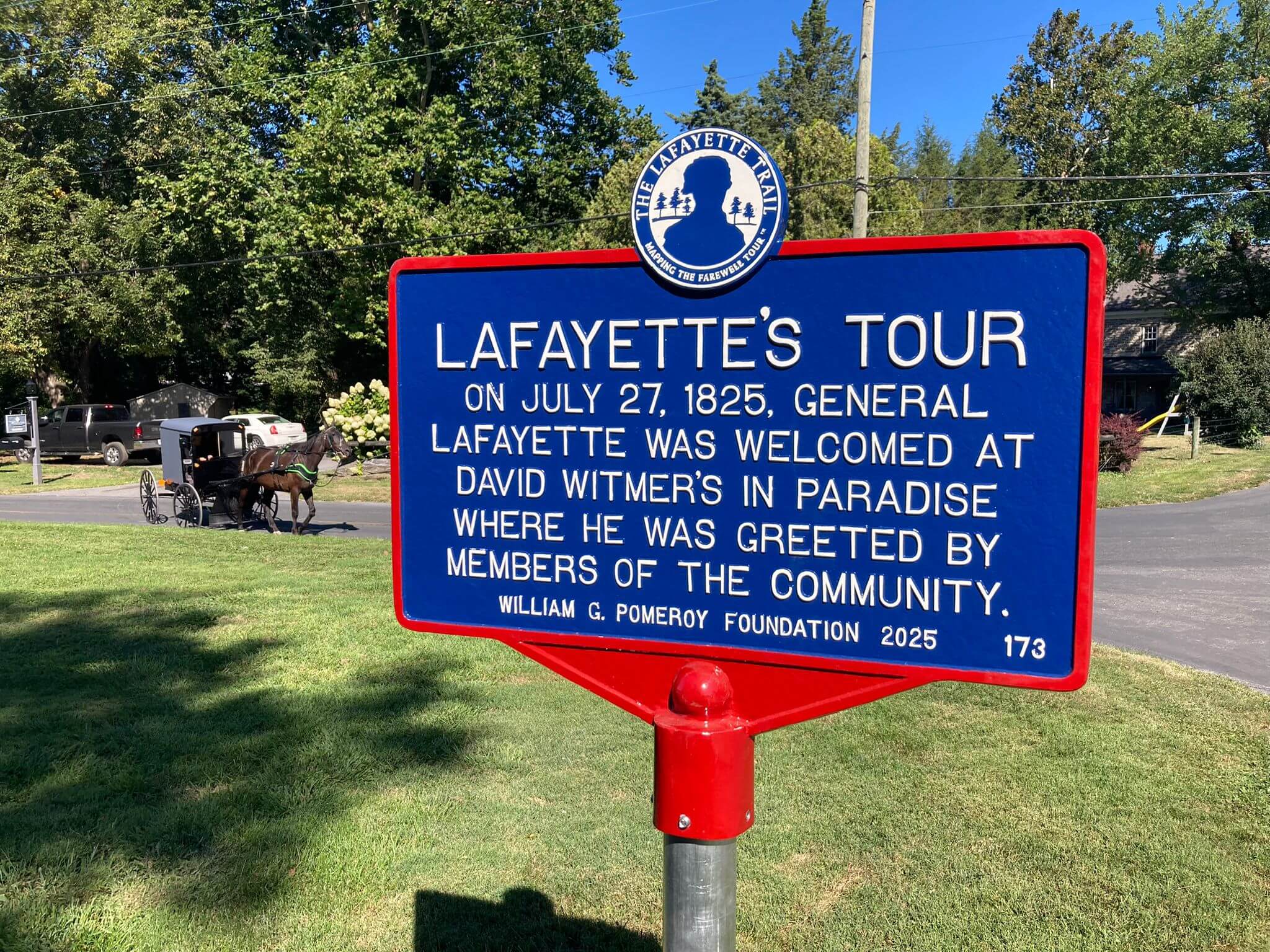 On Wednesday, July 27, 1825, Lafayette and his entourage left West Chester, PA and proceeded through Gap and Paradise, PA. In Paradise, he halted for a few minutes an the home of MR. David Witmer and was introduced to a crowd of ladies and gentlemen. Heading on , they eventually stopped for the night in Lancaster where Lafayette met with Revolutionary War veterans and attended a ball.