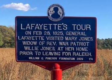 General Lafayette arrived in Halifax on Sunday evening, Feb. 27, where he spent the night at the Eagle Tavern. Before departing for Raliegh the next morning, he called on Mrs. Mary Jones, widow of Willie (Wyley) Jones, at their home “The Grove.” Due to her infirmity, she had been unable to greet Lafayette when he met with other local citizens the previous evening. In fact, she passed away the following August. Willie Jones (1741-1801) had served on the Council of Safety and was elected five times to the Provincial Congress. He is considered the principal author of the North Carolina State Constitution and one of the most influential men of the Revolutionary period in North Carolina. His wife, Mary Monfort Jones, was the daughter of Joseph Monfort, Colonel of the Continental Armey and a member of the Provincial Congress. (Historic Halifax, Birthplace of Independence. Historical Halifax Restoration Association, n.d. Accessed 11 June 2025)