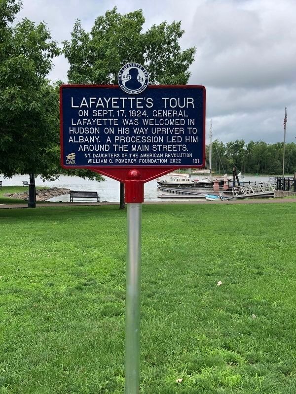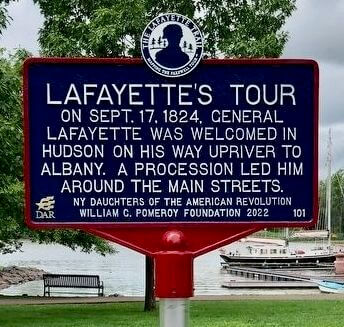 Traveling along the Hudson River by steamboat, General Lafayette arrived in Hudson, New York on Sept. 17, 1824 aboard the James Kent. During his brief visit, Lafayette was escorted along the main streets to the courthouse, where he met with the mayor, common council members, Daughters of Columbia, veterans, and citizens before departing for Albany, New York. The September 21, 1824 edition of the Evening Post recounted the veterans’ deep admiration for Lafayette:
