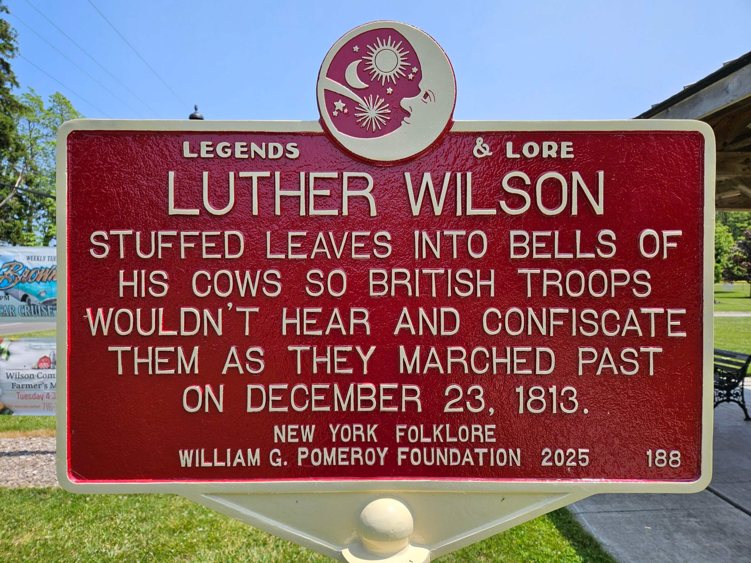 Luther Wilson was the son of Reuben Wilson, the founder of Wilson, NY. During the War of 1812, British soldiers marched through the village of Wilson, destroying many homes, on their way to Kempville (now Olcott) to destroy a grist mill. Luther, who was 15 at the time, was in the field tending to his family’s cows during the raid. He stuffed the cows’ bells with straw, hay, and leaves because he did not want the British to hear the cowbells. If the soldiers heard them, they would have taken the cows for the meat. Luther not only saved his own cows but also many that belonged to his neighbors. The story of Luther Wilson and the cow bells has become a local legend throughout Niagara County, where Wilson is located.