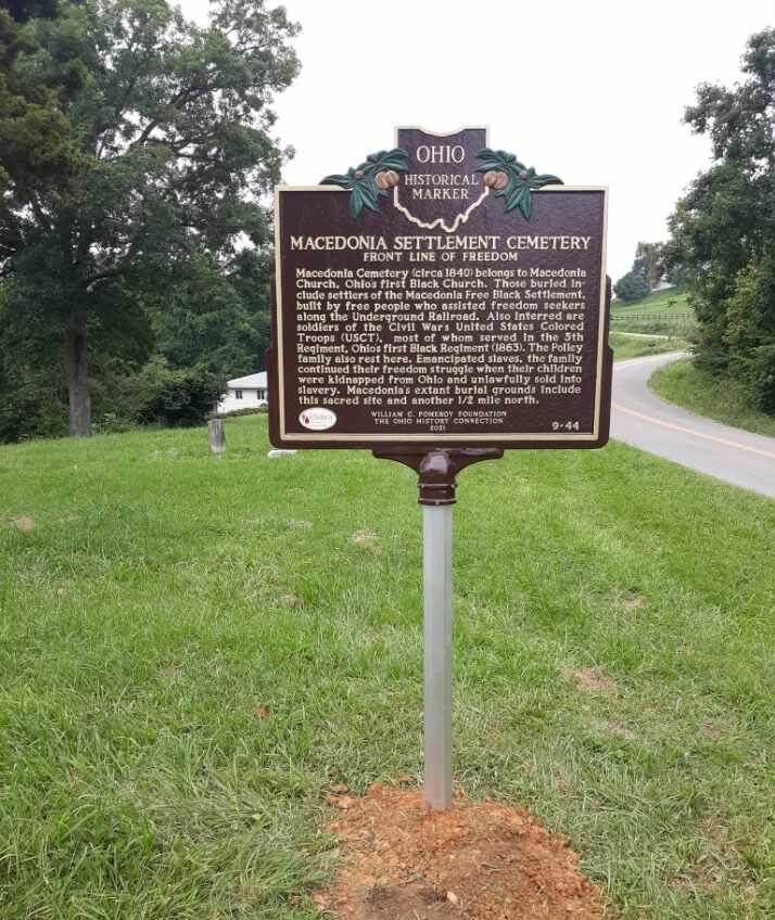 Macedonia Cemetery (circa 1840) belongs to Macedonia Church, Ohio’s first Black Church. Those buried include settlers of the Macedonia Free Black Settlement, built by free people who assisted freedom seekers along the Underground Railroad. Also interred are soldiers of the Civil War’s United States Colored Troops (USCT). most of whom served in the 5th Regiment, Ohio’s first Black Regiment (1863). The Polley family also rest here. Emancipated slaves, the family continued their freedom struggle when their children were kidnapped from Ohio and unlawfully sold into slavery. Macedonia’s extant burial grounds include this sacred site and another 1/2 mile north.