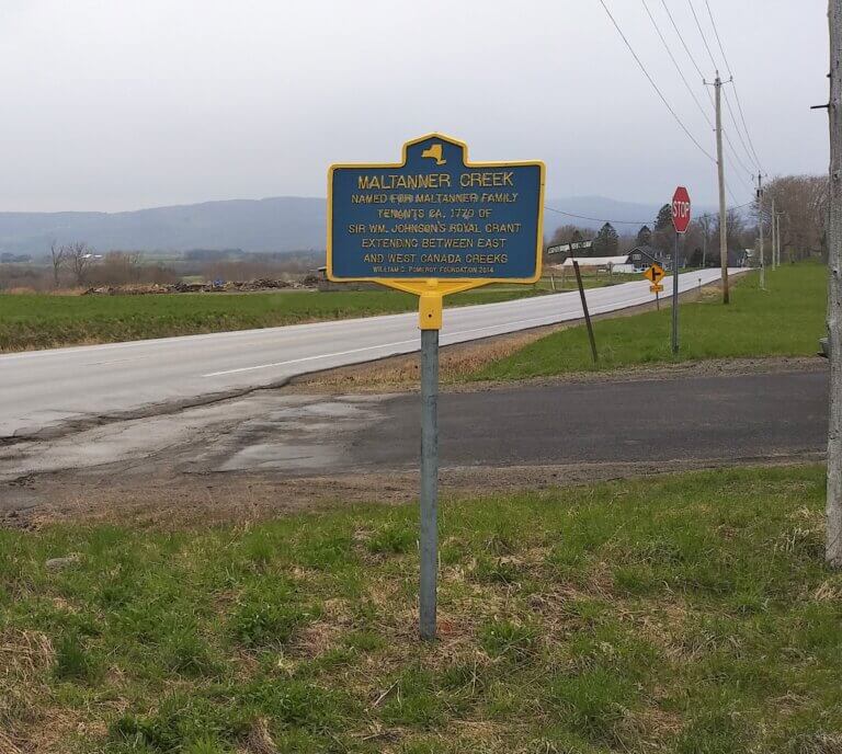 Around 1770, Sir William Johnson sent three tenant families to reside on his Royal Grant. These families were “Maltanner, Goodbread or Goodbrodt and Shaver or Shaffer” (A History of Herkimer County, Nathaniel S. Benton, 1856). They selected lots 47, 48 and 49 according to the 1857 Plat Map of the Town of Fairfield. These lots bordered the creek and therefore explains how Maltanner Creek came to be named. Each family was promised a “three-lives-lease title to 105 acres” (The Frontiersmen of New York, Jeptha R. Simms, 1883). This applied in 1800 when the wife of John Maltanner, the head of the Maltanner family, went to Surrogate’s Court after her husband’s death. She was able to keep the property because John “held a lease from Sir William Johnson for his own life and the life of his two sons” for the land (1800 Herkimer County, NY Surrogate Court Records).