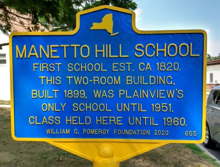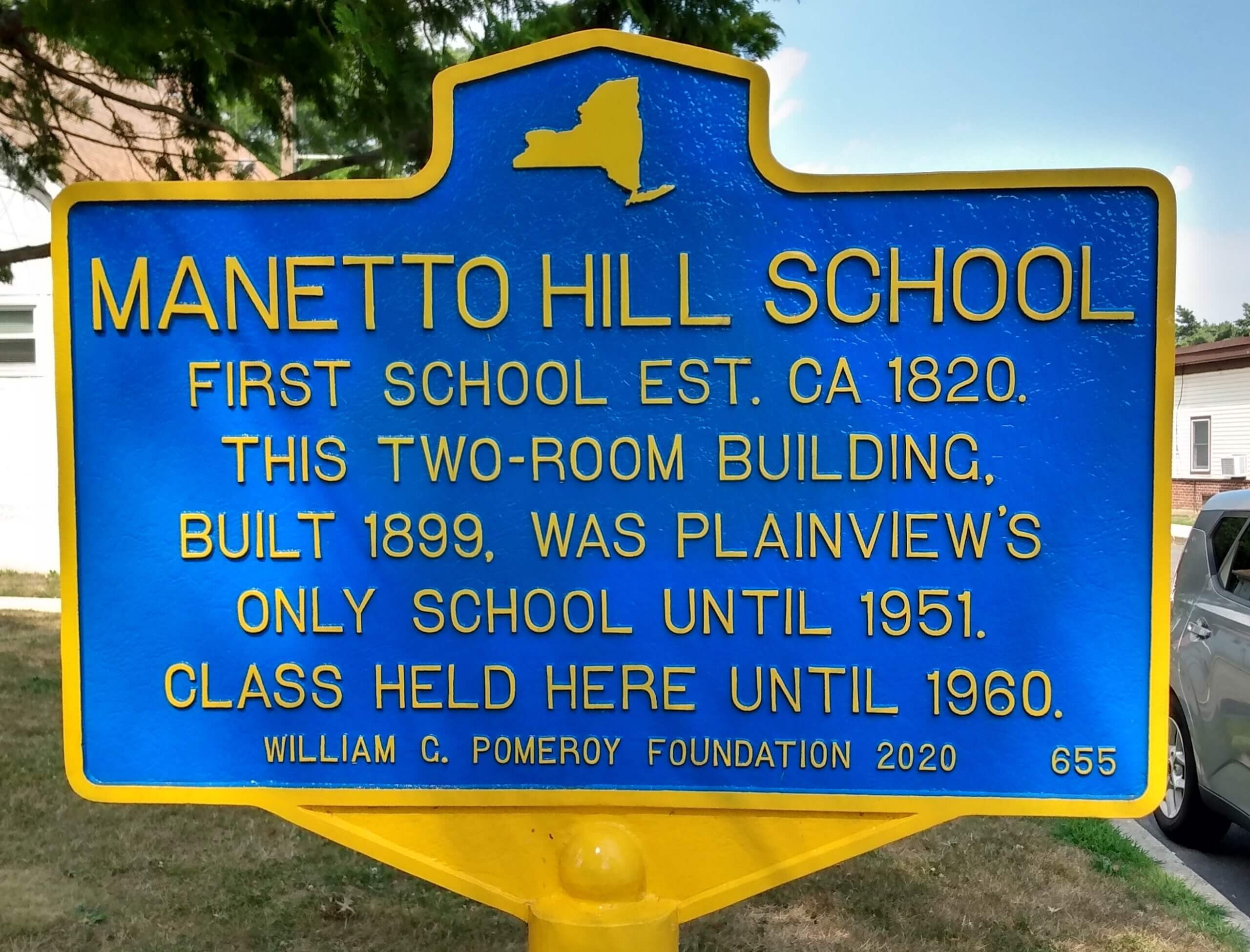 The school districts in the Town of Plainview were established in 1814. The town’s first school building was erected soon after on a site at Manetto Hill. The building served as the town school until 1899, when it was replaced with a two-room school building that, as of 2020, still stands.