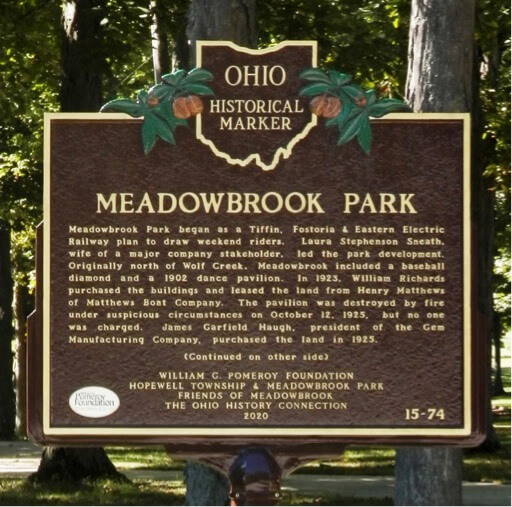 MEADOWBROOK PARKMeadowbrook Park began as a Tiffin, Fostoria & Eastern Electric Railway plan to draw weekend riders. Laura Stephenson Sneath, wife of a major company stakeholder, led the park development. Originally north of Wolf Creek, Meadowbrook included a baseball diamond and a 1902 dance pavilion. In 1923, William Richards purchased the buildings and leased the land from Henry Matthews of Matthews Boat Company. The pavilion was destroyed by fire under suspicious circumstances on October 12, 1925, but no one was charged. James Garfield Haugh, president of the Gem Manufacturing Company, purchased the land in 1925. (Continued on other side)