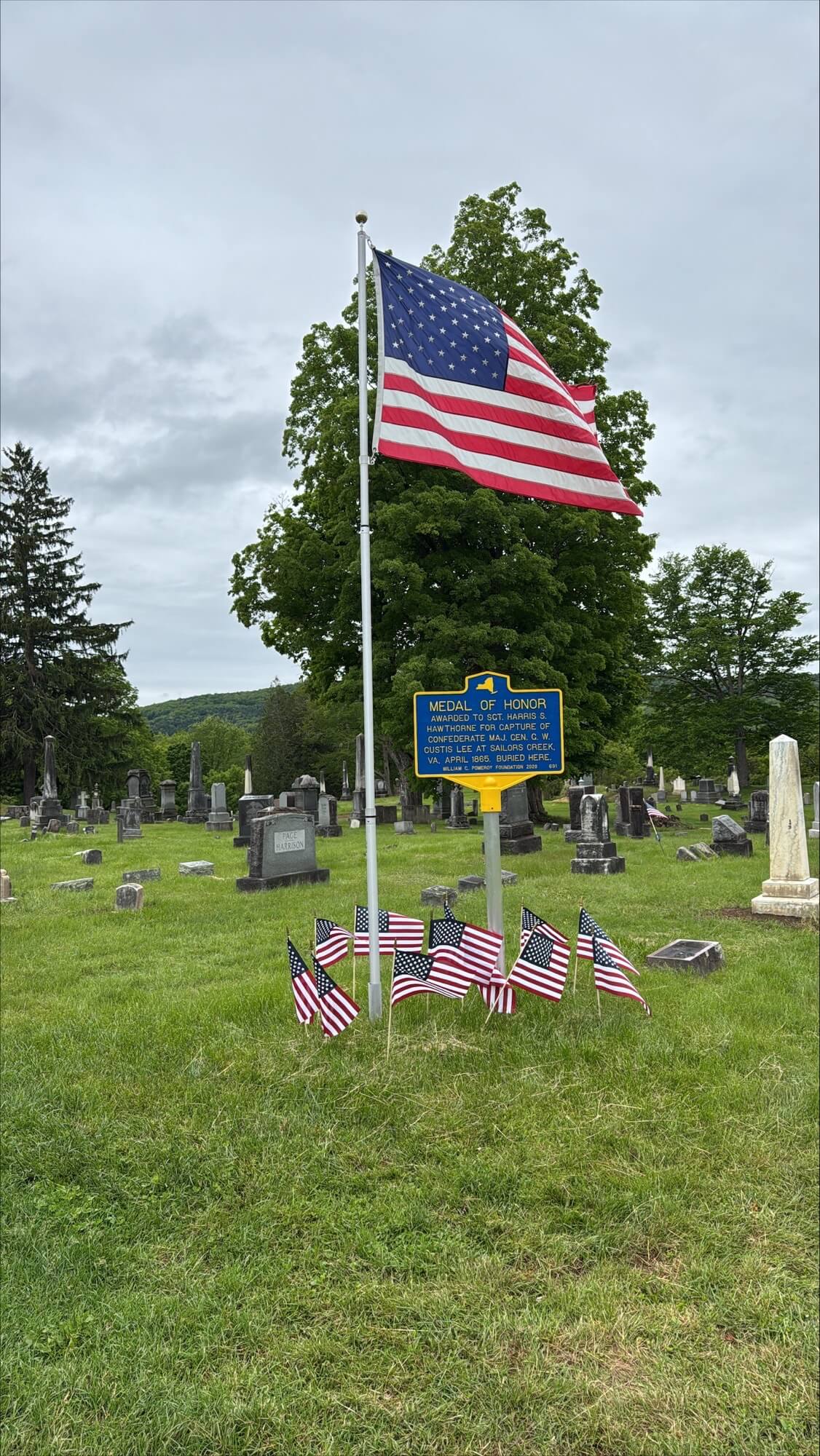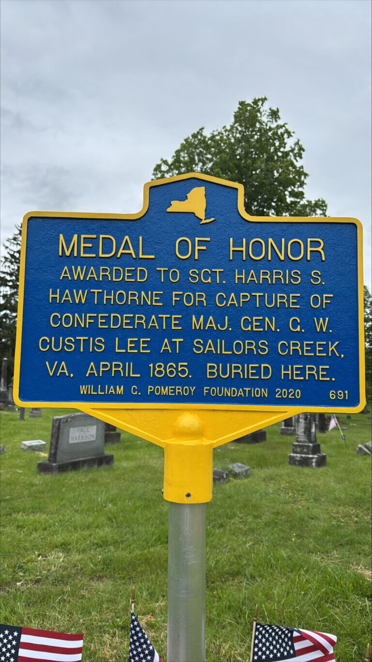 The Lower Maple Grove Cemetery serves as the final resting place of Medal of Honor recipient and Civil War veteran, Sergeant Harris S. Hawthorne (1832-1911). Originating from the U.S. Civil War, the Congressional Medal of Honor is the highest military award that can be received by a member of the U.S. Armed Forces. Over 1,000 men who served within the Union Army were awarded the Medal of Honor for gallantry and bravery during the war. Harris S. Hawthorne served in Co. F. of the 121st of the New York Infantry during the U.S. Civil War. On April 6th 1865 in Sailor’s Creek, Virginia he helped capture Confederate General George Washington Custis Lee, son of Commander of the Confederate Army General Robert E. Lee. President Grover Cleveland awarded Harris S. Hawthorne the Congressional Medal of Honor for this heroic act in 1894.