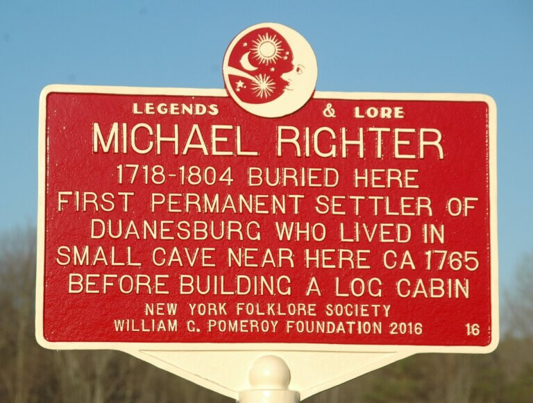 Michael Righter was Duanesburg’s first resident, purchasing Lot # 84 in 1757 from James Duane, founder of the Town of Duanesburg. Lore suggests that before building a log cabin, he first lived in a limestone cave on this lot which gave him protection from the elements and from activity during the American Revolution. James Duane wrote in his diary of visiting Righter in 1765 and staying the night with him in the cave. Righter bought his land for 40 pounds payable over four years, but didn’t complete payment until nearly three decades later. He is buried in the Duanesburg Village Cemetery.