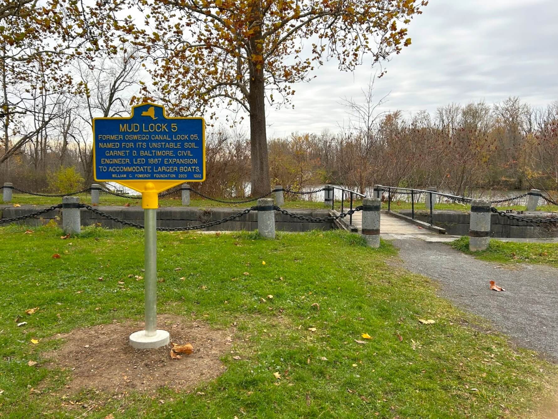 Officially known as Oswego Canal Lock O5 at the time it was constructed in 1828, the mud lock was rebuilt and enlarged several times. Completed in 1829, the Oswego Canal stretched from Lake Ontario to the Erie Canal in downtown Syracuse. In 1887, Garnet D. Baltimore, a civil engineer and first Black graduate of Rensselaer Polytechnic Institute, was hired to help extend the length of the lock to accommodate the longer canal boats. The “mud lock” gained its nickname from the mud flats in area caused by shifting and unsteady soil akin to quicksand. The sturdy stone walls that as of 2025 were still standing are a testament to Baltimore’s engineering skills.