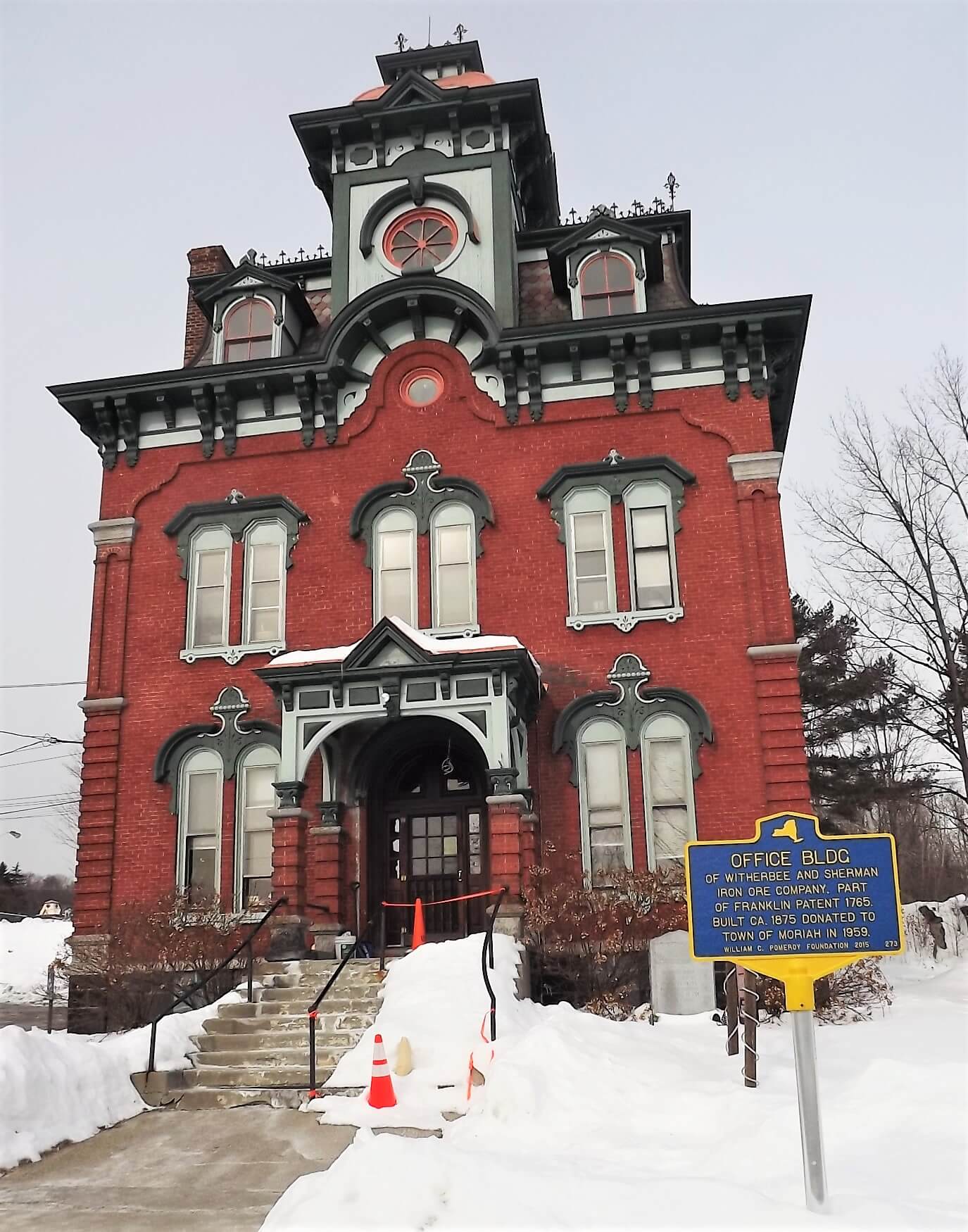 When Witherbee and Sherman Iron Ore Company was at its peak, they built an office in Port Henry. Described by the Lakes to Locks PassagePort website as being of French Second Empire style and with “elaborate details [that] attest to the prosperity of the mining magnates at the time,” the office building was meant to showcase the company’s “confidence in the industry’s future.” The office was constructed on Lake Champlain so that it would be near the site used for production and shipping. After it was given to the Town of Moriah in 1959, the building was converted into Town Hall. Not far away on the same property is the old company carriage house, which at one time had been used as an icehouse and laboratory. The building took on new life as the Iron Center Museum and showcases the history of mining in the area.