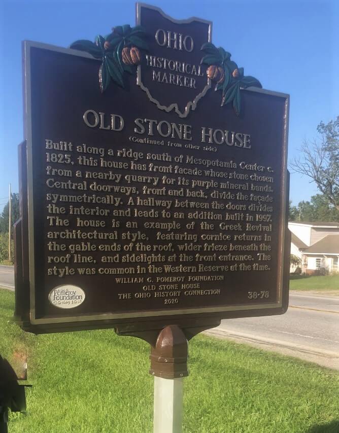 (Continued from other side) Built along a ridge south of Mesopotamia Center c. 1825, this house has front facade whose stone chosen from a nearby quarry for its purple mineral bands. Central doorways, front and back, divide the façade symmetrically. A hallway between the doors divides the interior and leads to an addition built in 1997. The house is an example of the Greek Revival architectural style, featuring cornice returns in the gable ends of the roof, wider frieze beneath the roof line, and sidelights at the front entrance. The style was common in the Western Reserve at the time.