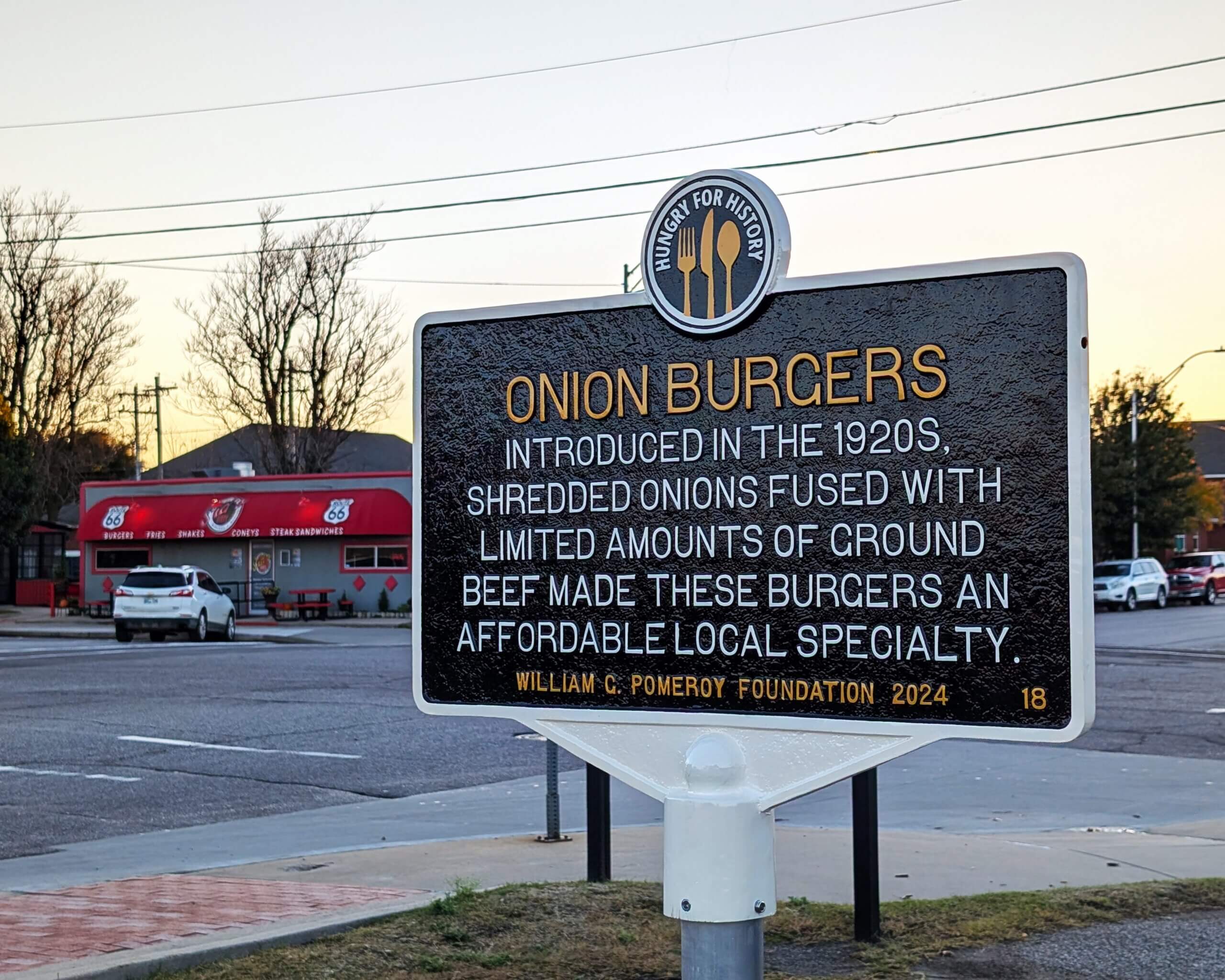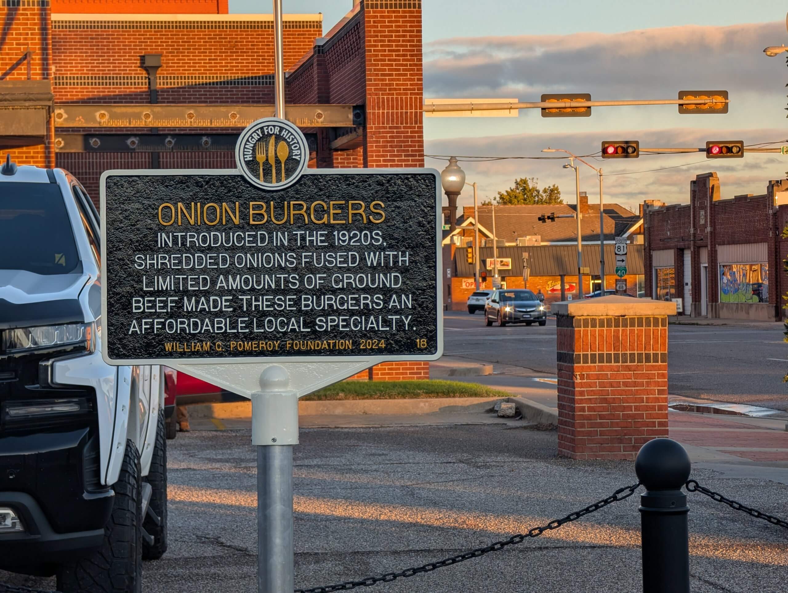 This marker commemorates the creation and longevity of the fried onion hamburger, created during economic hard times and celebrated with an annual festival in El Reno beginning in 1988. According to Rhys Martin, President of the Oklahoma Route 66 Association, this simple dish shows ingenuity and resourcefulness [by] amending a common recipe with a unique addition, highlighting the resourcefulness of [local residents].