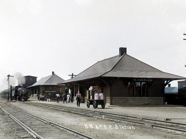 Built during the town of Warsaw’s golden age of manufacturing, the Park Street passenger depot opened in February 1906 to accommodate riders on the Buffalo, Rochester and Pittsburg Railway. The Western New-Yorker (16 Feb 1906) called it a “credit to the town.” The ladies’ waiting room was situated at the south and the men’s waiting room on the north with the ticket office midway between. The waiting rooms were heated by steam and each had its own ‘toilet room.’ Public areas were furnished with “…handsome settees along the sides and a double, back to back settee in the center of each room…The new building is lighted at night by electricity outside and in.” Built at a cost of $4,000, the articles exclaimed, “…the traveling public will find it all that can be desired.”