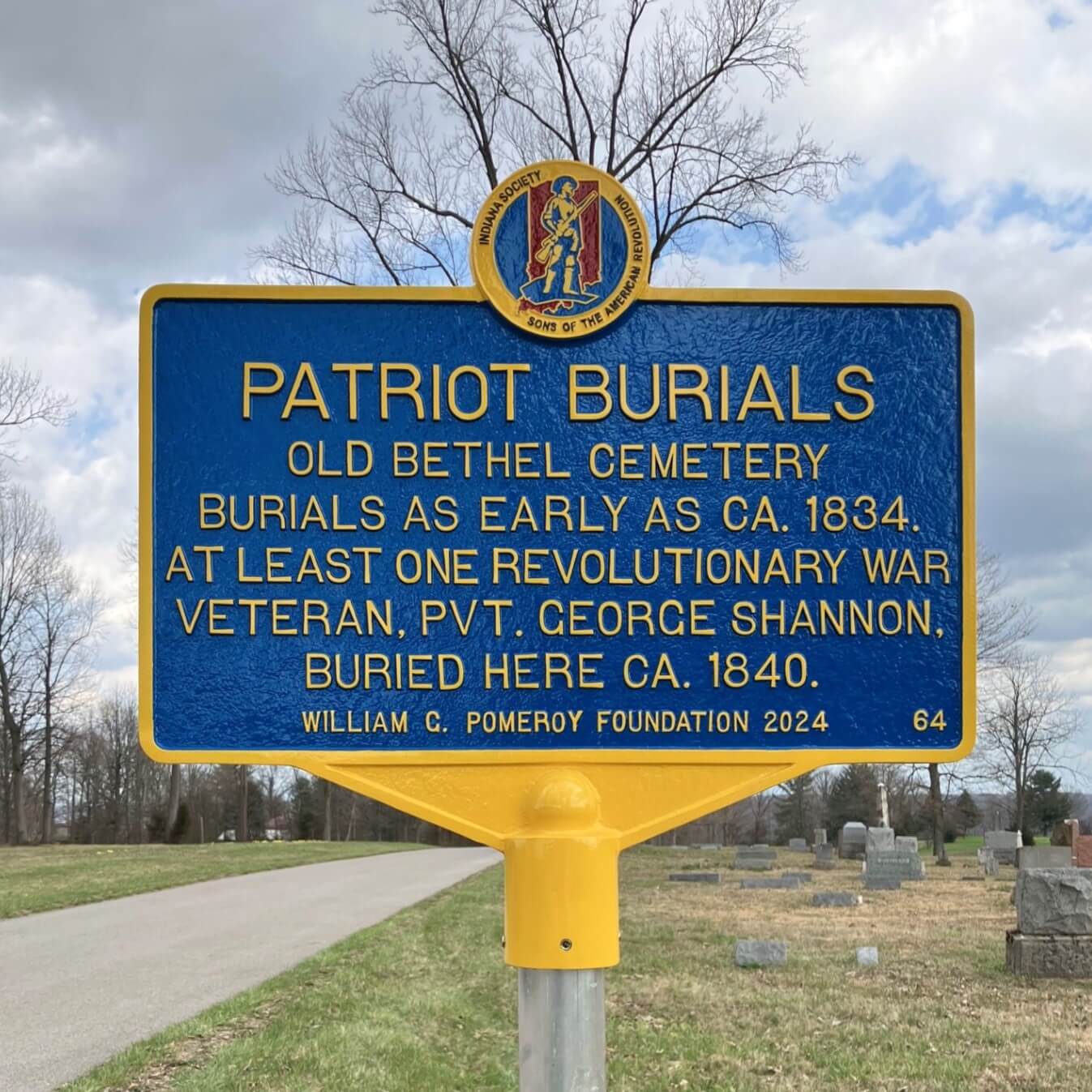 Old Bethel Cemetery is the final resting place of the community’s early residents. Among those buried here is at least one Revolutionary War Veteran, Private George Shannon, who served several stints in Pennsylvania. While on duty, Shannon was injured during a skirmish when a bullet grazed his hip bone. Despite the wound, Shannon returned to service not long after. Following the War, Shannon qualified for a pension in Virginia, and then again upon moving to Indiana. He passed away and was buried in Old Bethel Cemetery in 1840.