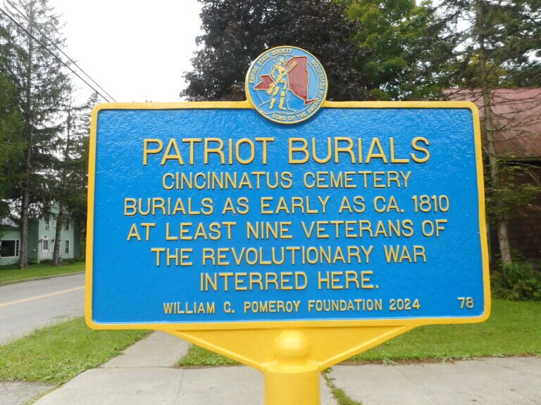 Cincinnatus Cemetery is the final resting place of many of the community’s early residents with burials as early as circa 1810. Among those interred here are at least nine veterans of the American Revolution: Lawrence White, David Wattles, Thomas Rockwell, David Brown, Mitchell Kingman, Ebenezer Jones, Solomon Dickinson, Zuriel Raymond and Moses Root. Several of these veterans served in Massachusetts and Connecticut before making their way to central New York.