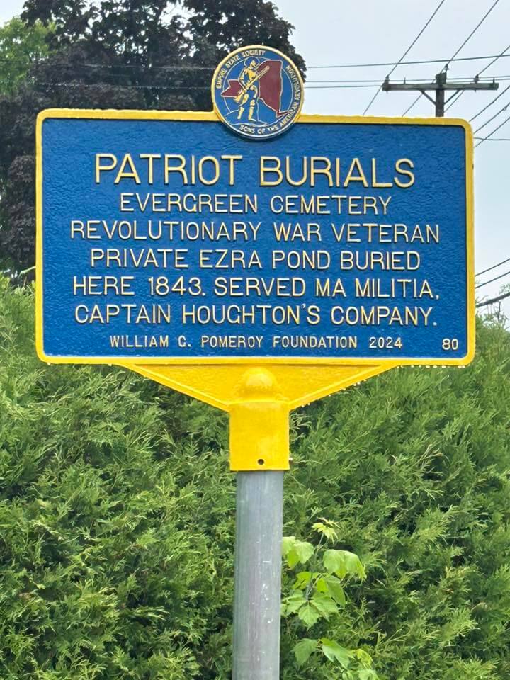Evergreen Cemetery is the final resting place of many of the community’s early residents. Among those buried here is Revolutionary War Veteran Ezra Pond, who served as a private in the Massachusetts Militia in Captain Houghton’s Company and was interred in 1843. Pond qualified for a pension while living in Essex County, New York, and in his testimony detailed several stints of service in the Massachusetts Militia during the War.