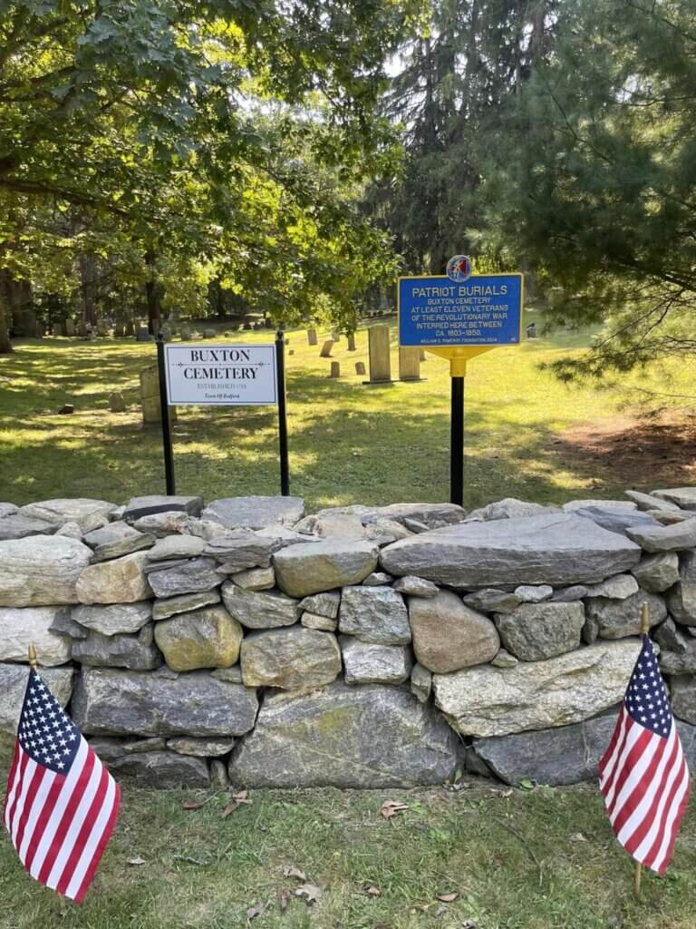 Buxton Cemetery is the final resting place of the community’s early residents. Among those buried here are at least eleven veterans of the Revolutionary War who were interred between ca. 1816 – 1850: Abraham Barrett, Samuel Barrett, Cornelius Clark, Ezekiel Harris, Moses Higgins, Samuel Holmes, James Lyon, Roger Lyon, Marcus Moseman, Peter Moseman and Eli Tyler.