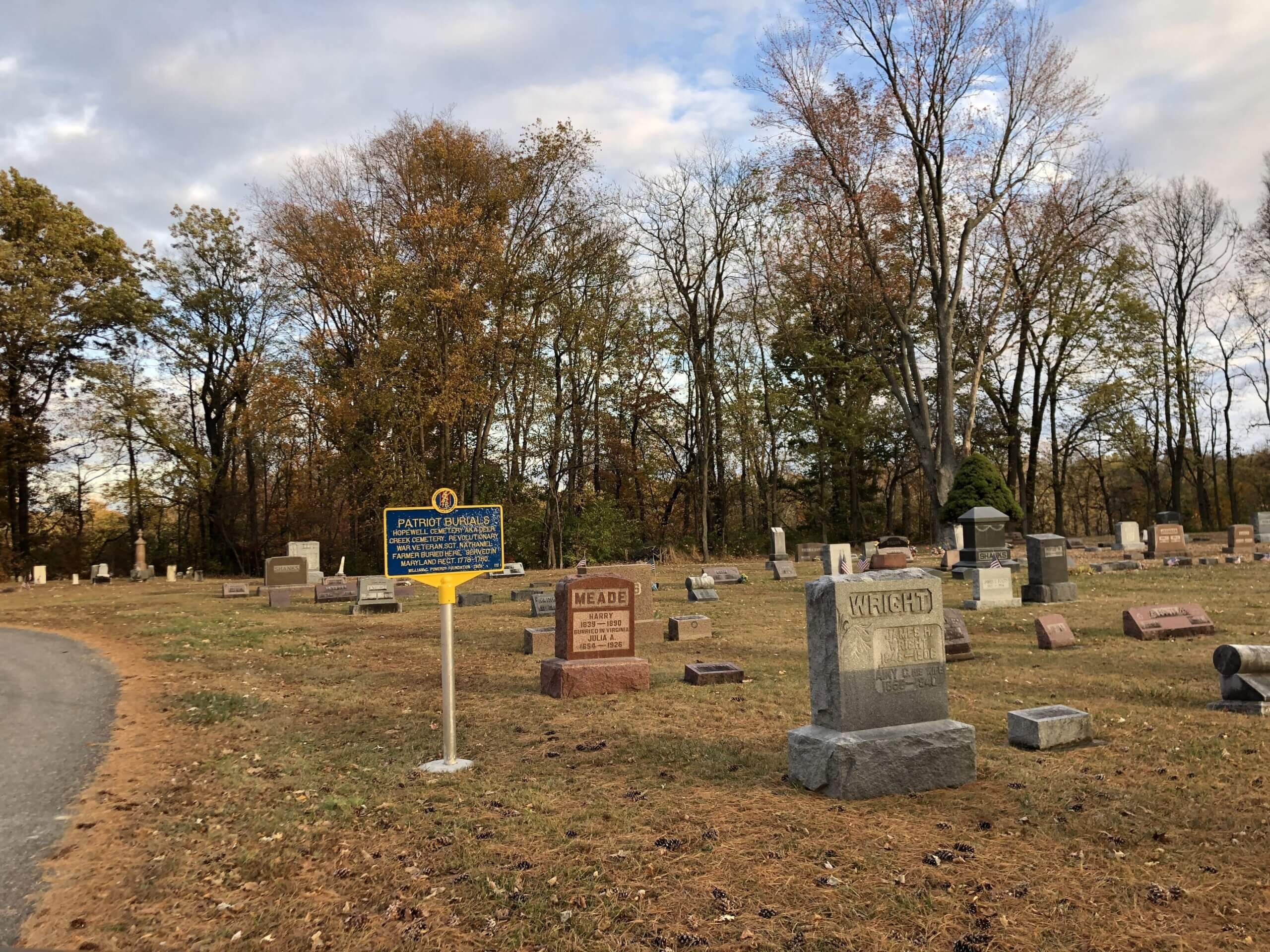 Hopewell Cemetery, which is also known as Deer Creek Cemetery, is the final resting place of many the community’s early residents, including Revolutionary War veteran sergeant Nathanial Farmer, who served in a Maryland regiment from 1778 – 1780.