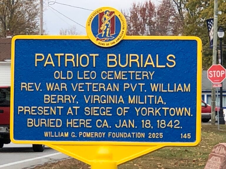 Old Leo Cemetery is the final resting place for many of the community’s early residents, beginning in 1830. Among those buried here is Revolutionary War veteran William Berry, who fought in the Virginia Militia and was present at the Siege of Yorktown. The Siege of Yorktown, which began September 28, 1781, and ended on October 19, 1781, is considered the effective end of the war with the defeat of Lord Charles Cornwallis. Cornwallis was captured and the British troops surrendered, forcing Great Britain’s hand to negotiate an end to the war.
