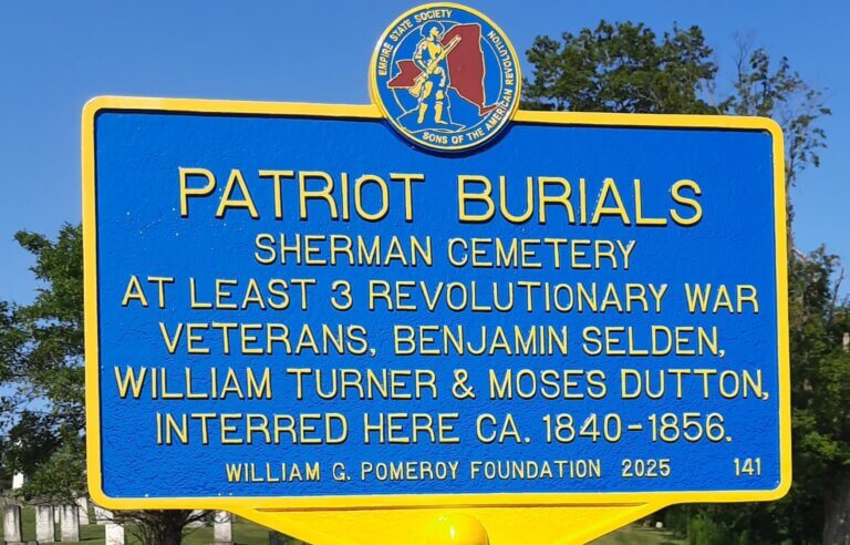 Sherman Cemetery is the final resting place of many of the community’s early residents. Among those buried here are at least three Revolutionary War veterans, including Benjamin Selden, Moses Dutton and William Turner.