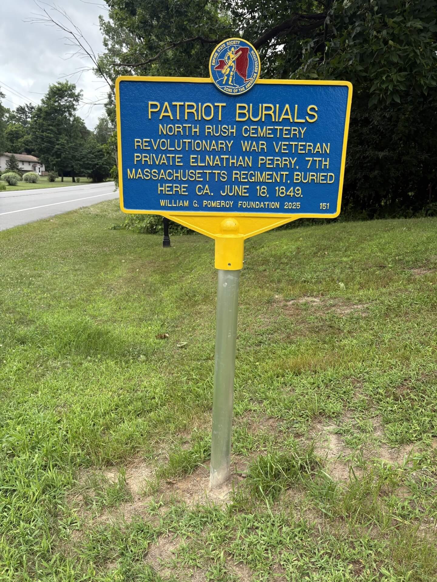 North Rush Cemetery is the final resting place of many of the community’s early residents, with burials as early as 1807. Among those interred here is Elnathan Perry, born in 1761 in Wrentham, MA, and interred on June 18, 1849. Perry served in the 7th Massachusetts Regiment as a Private in 1778.