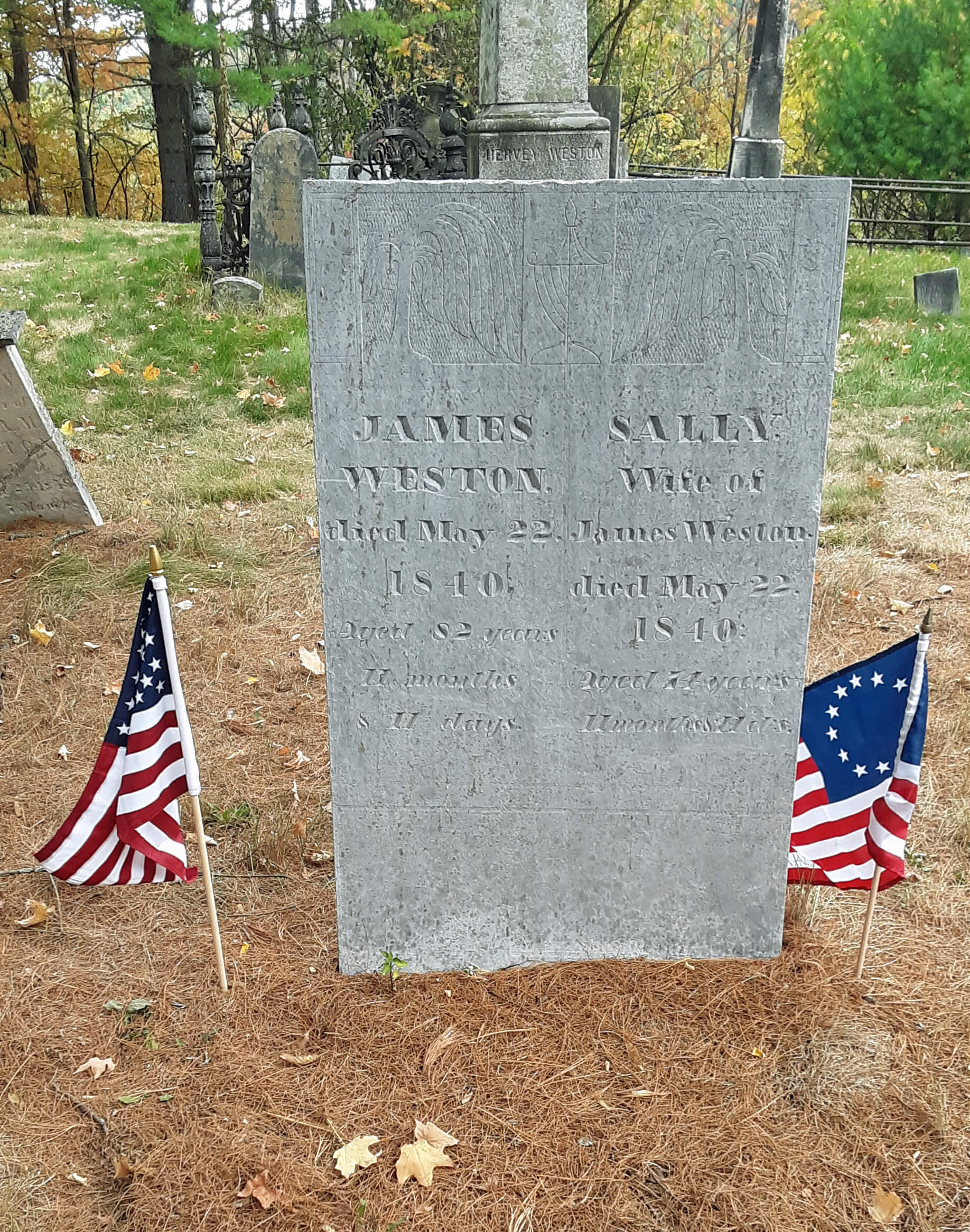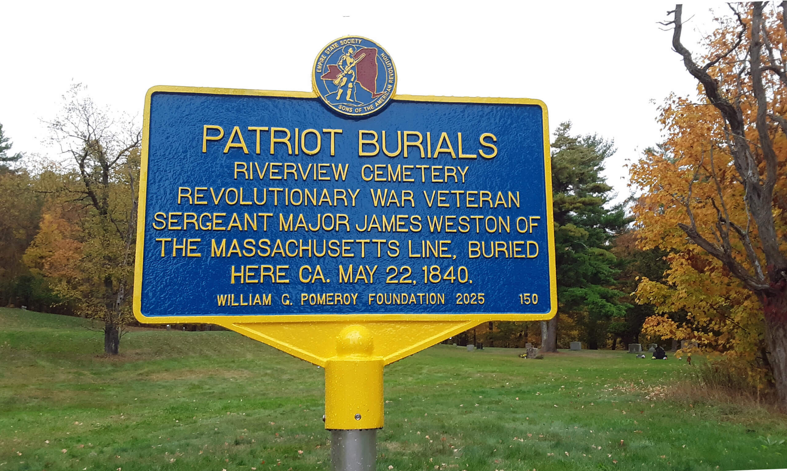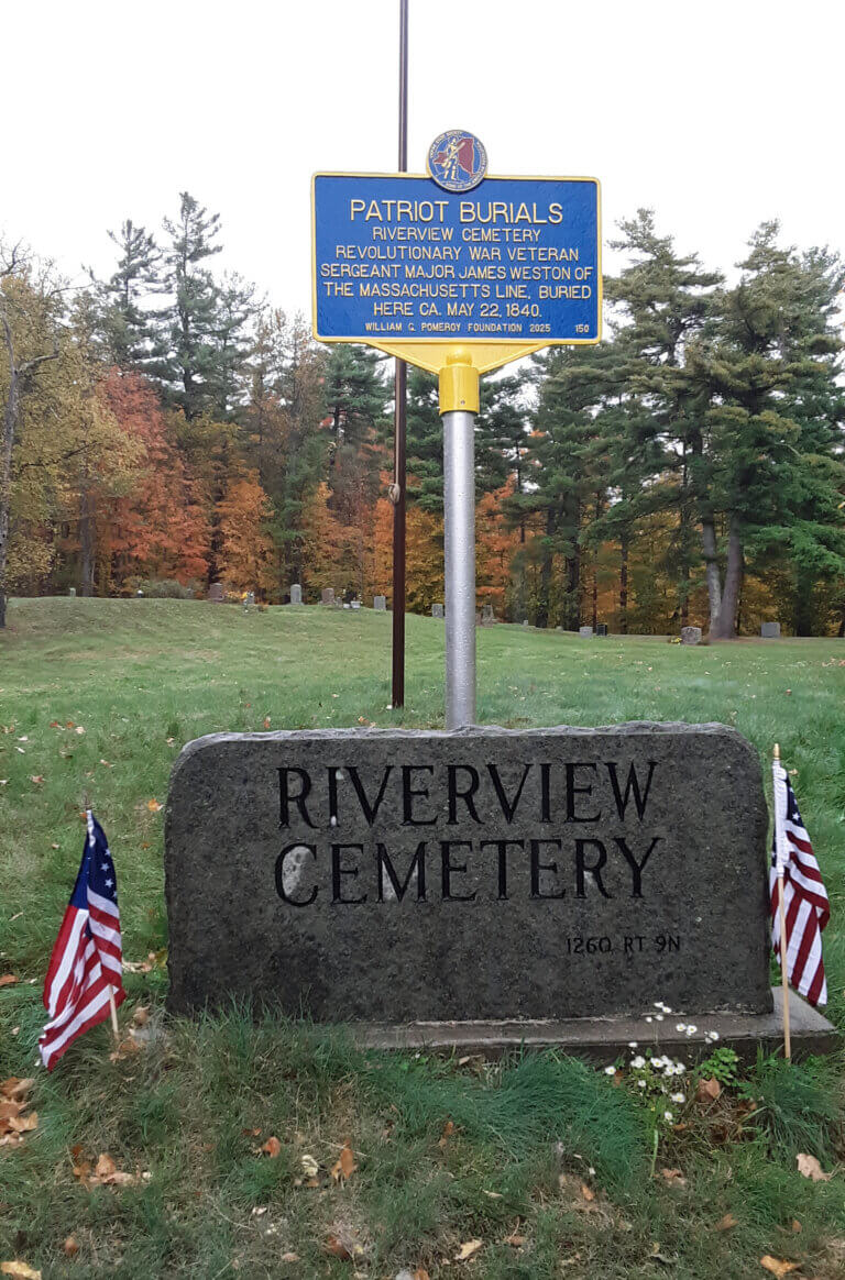 Riverview Cemetery is the final resting place of many of the community’s early residents, with burials as early as 1813. Among those interred here is Sergeant Major James Weston of the Massachusetts Line who was interred here in 1840. Weston was born in Middleborough, MA, in 1755. Weston served in Colonel Nixon’s Regiment for 3 years, starting in 1777.
