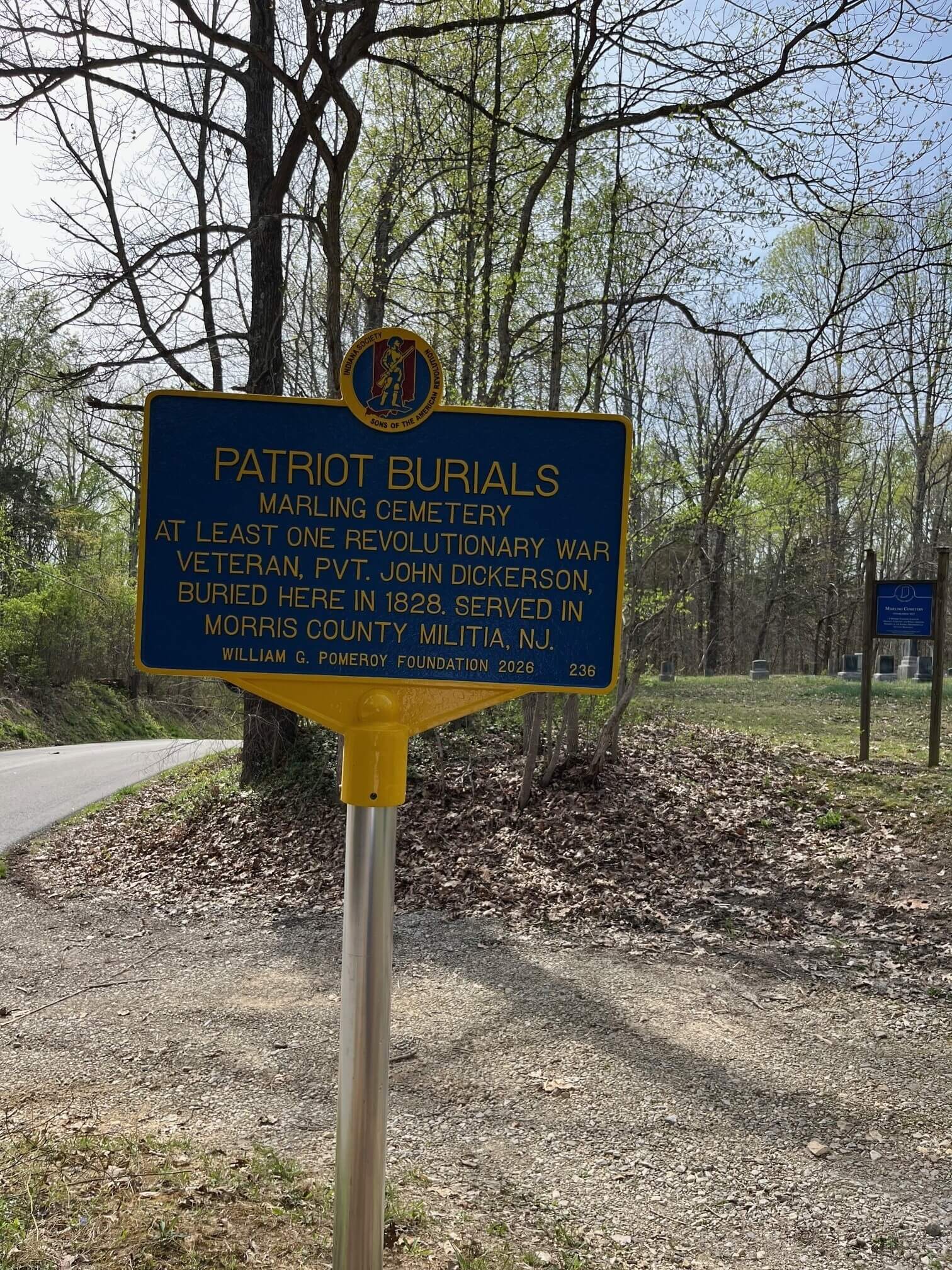 Marling Cemetery is the final resting place of many of the community’s early residents. Among those interred here is at least one veteran of the American Revolution, Private John Dickerson, who served in New Jersey in the Morris County Militia during the War.