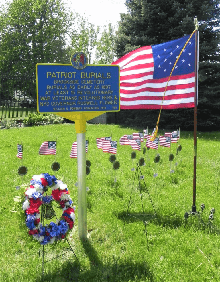 With burials as early as 1807, there are at least fifteen Revolutionary War veterans interred in Brookside Cemetery. It is also the final resting place of several New York State politicians, including the former Governor of New York Roswell P. Flower (1835-1899) and four New York State Congressmen: George A. Bagley (1826-1915), Ambrose W. Clark (1810-1887), Charles Ezra Clarke (1789-1863), and Orville Hungerford (1790-1851).