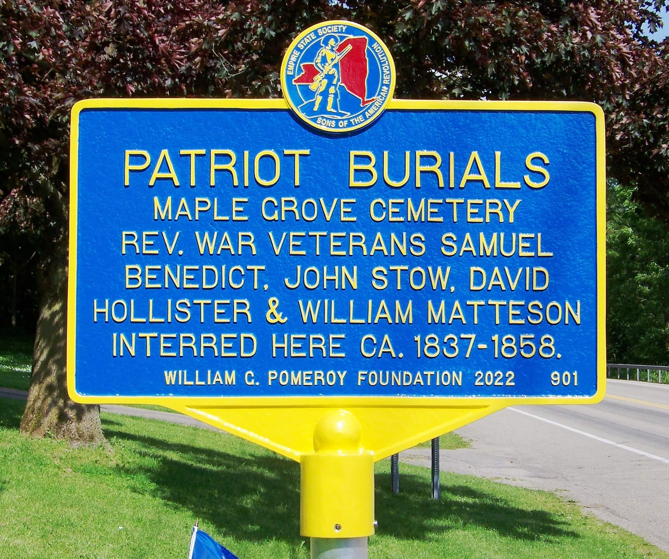 Maple Grove Cemetery is the final resting place of the community’s early residents. Among those buried here in between ca. 1837-1858 are at least four Revolutionary War veterans: Samuel Benedict, John Stow, David Hollister, and William Matteson.
