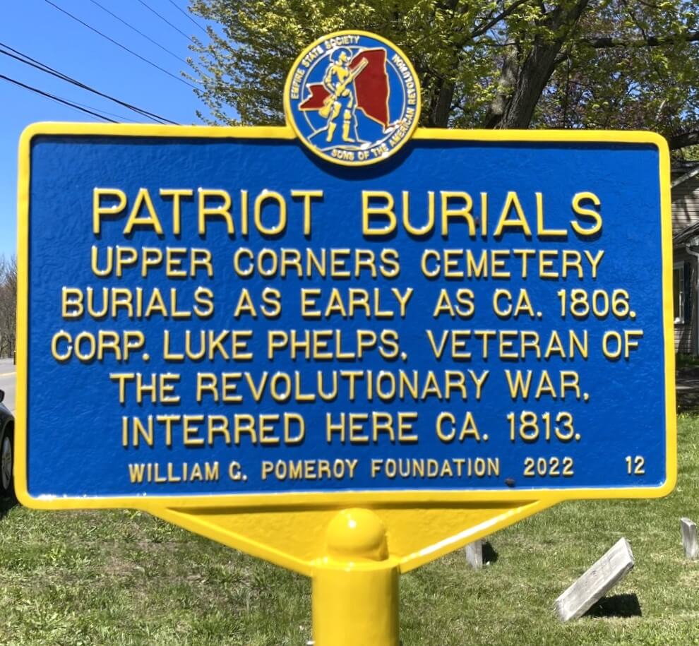 With burials as early as circa 1806, Upper Corners Cemetery is the final resting place of the community’s early residents. Among those, buried here circa 1813 is Revolutionary War veteran Corporal Luke Phelps.